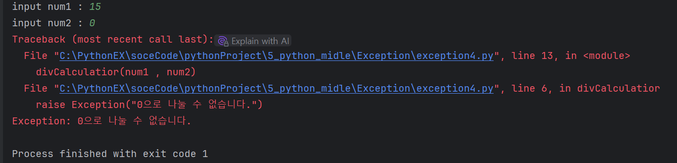 - raise Exception()으로 에러가 나올 떄 문구를 출력 하게 만들어준다. (에러생성)