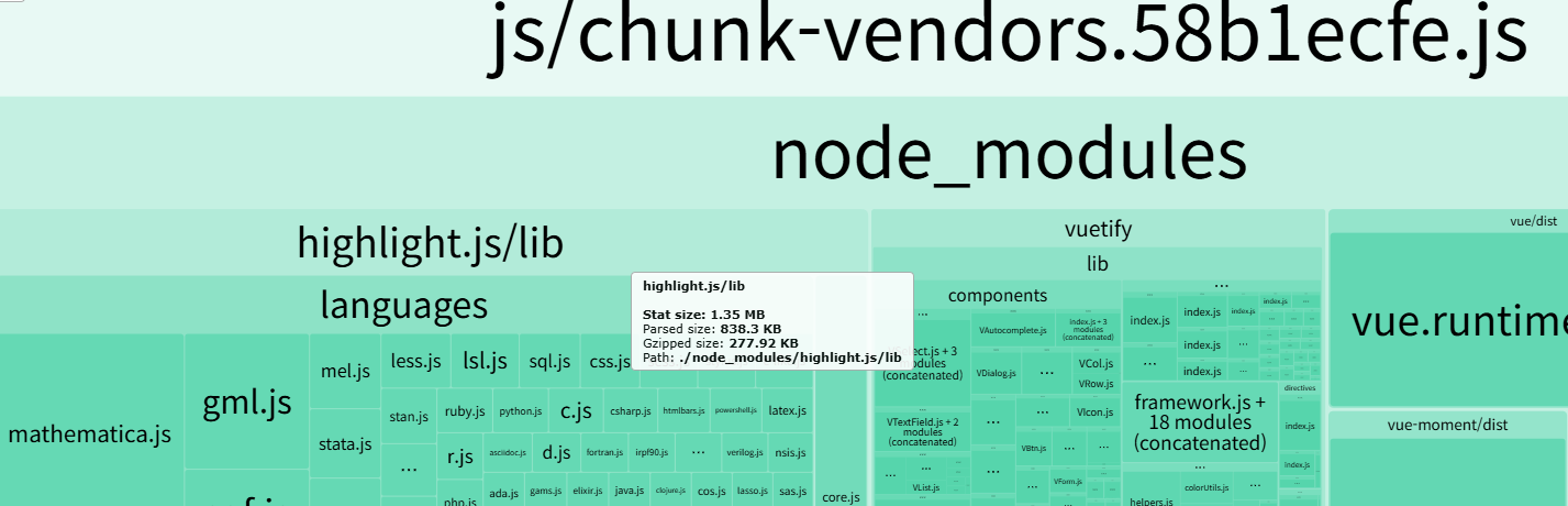 아래는 chunk-vendors 내부의 highlight.js 라이브러리가 차지하는 용량이다.