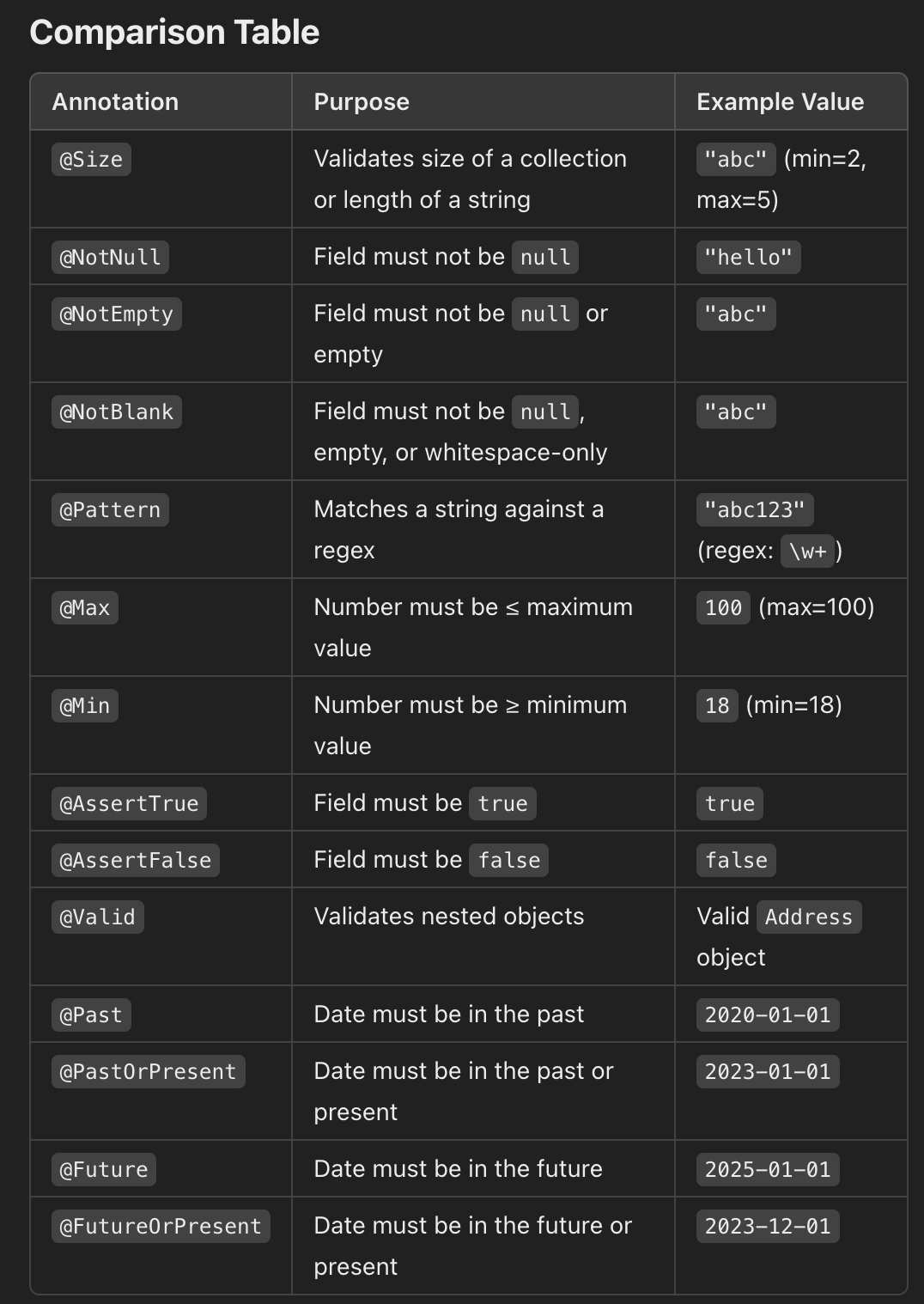 @Past validates that a java.util.Date or java.time object represents a date/time in the past.@PastOrPresent validates that a date/time is in the past or present.@Future validates a date/time is in the future@FutureOrPresent validates that a date/time is in the future or present.@Past