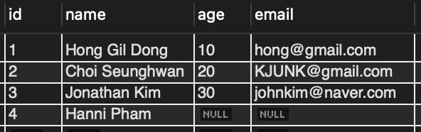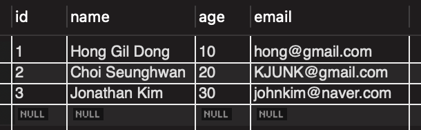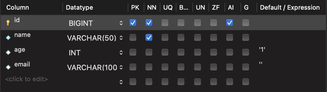 user table which has the following columns: id, name, age, email.id is the primary key and it is configured to be auto-incrementing.age and email have respective default values of '1' and ''.user table is filled with rows as following: