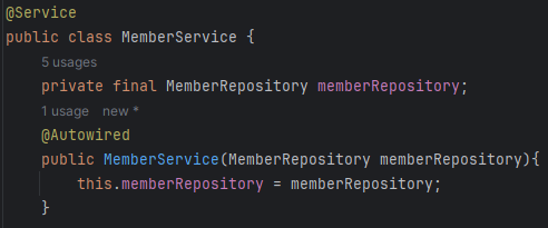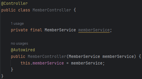 생성자에 @Autowired가 있으면 스프링이 연관된 객체를 스프링 컨테이너에서 찾아서 넣어준다. 이렇게 객체 의존관계를 외부에서 넣어주는 것을 DI (Dependency Injection), 의존성 주입이라 한다.