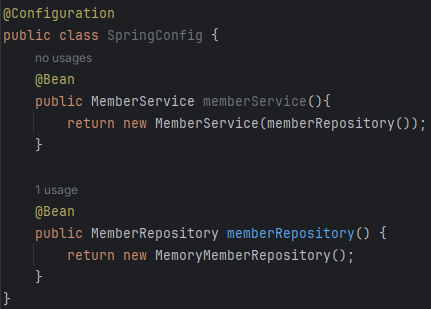 설정 파일을 따로 구성한 후 스프링 빈에 등록할 것들을 @Bean 으로 구현한다.