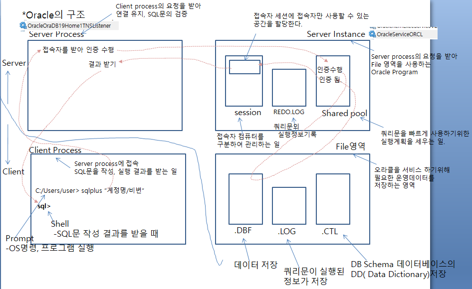 DB Client 프로그램 : xxxListener(ServerPocess)서버에 접속하는 DB 클라이언트 SQL문과 SQLPlus문 사용할 수 있다.