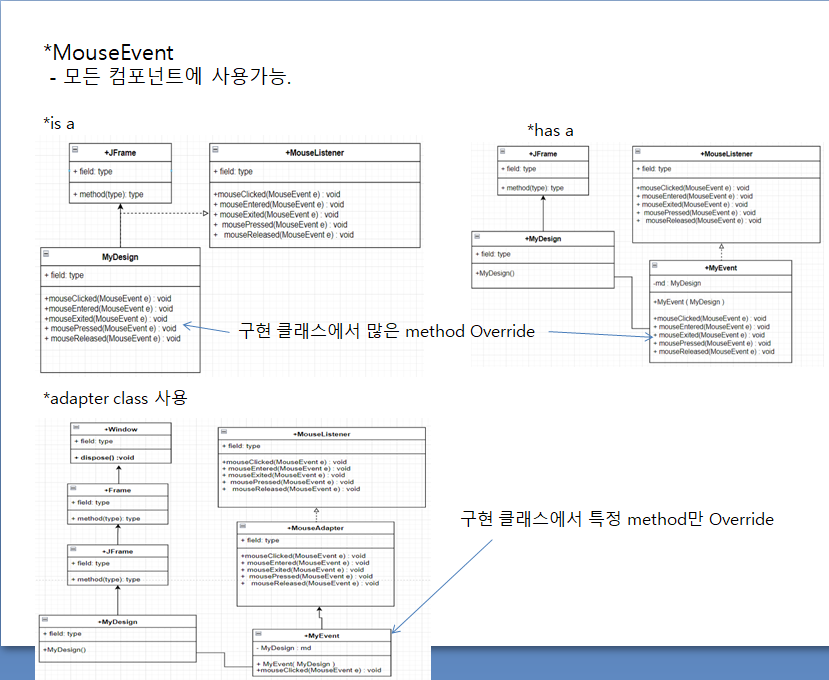 다른 컴포넌트에서 같은 이벤트가 발생하면, 이벤트 처리 method안에서 이벤트를 발생시킨 컴포넌트를 비교하여 처리한다.