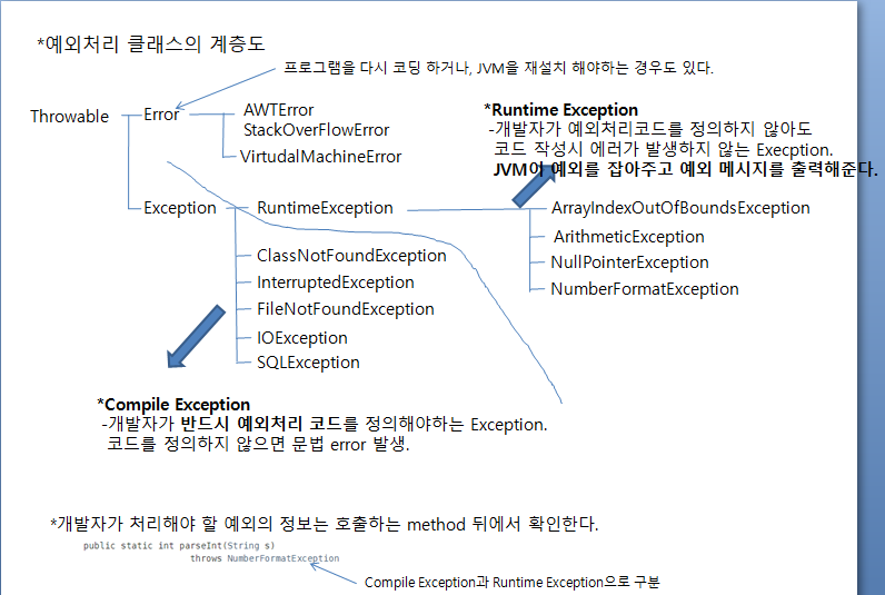 runtime exception : 생상된 bytecode를 사용하여 저장하고 연산하는 도중에 발생하는 예외. IDE에서 안알려줌.