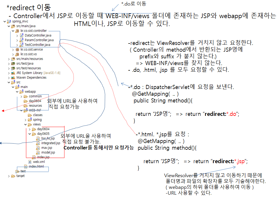 Controller에서 JSP로 이동할 때 WEB-INF/views폴더에 존재하는 JSP와 webapp애 존재하는 HTML이나, JSP로 이동할 수 있다.