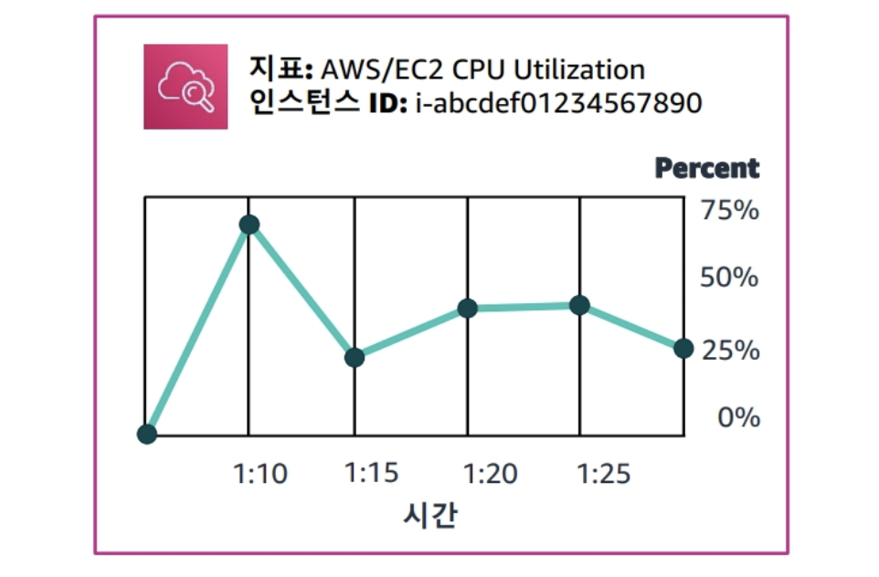 다음과 같은 지표는 EC2 CPU 사용률에 대한 데이터이다. AWS의 모든 서비스에서는 기본적으로 리소스 관련 지표를 제공한다. CloudWatch 에서는 지표에 대한 데이터를 일련의 데이터 요소로 저장한다. 각 데이터 요소에는 연결된 타임스탬프가 있다.