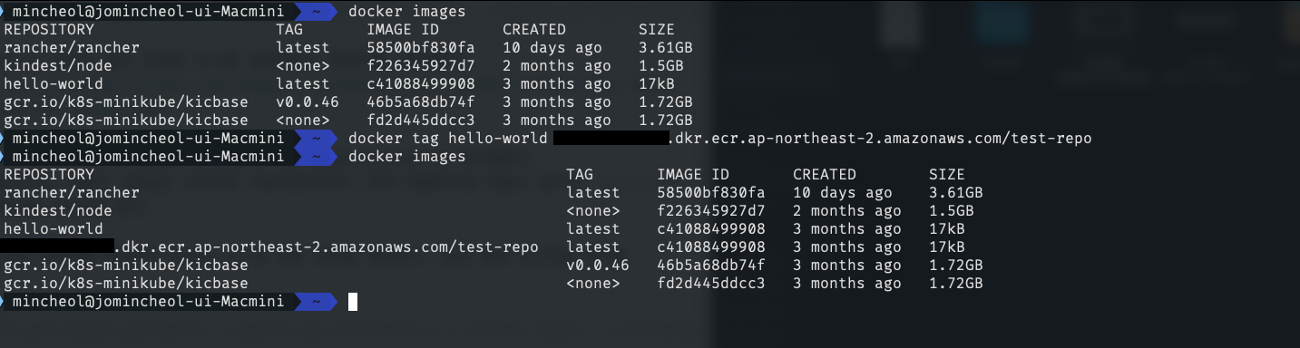 이제 이미지를 push 하기만하면 된다. 그전에 이미지 태그를 달아줘야하는데 태그는 repositoryurl 형식으로 지어주면된다.