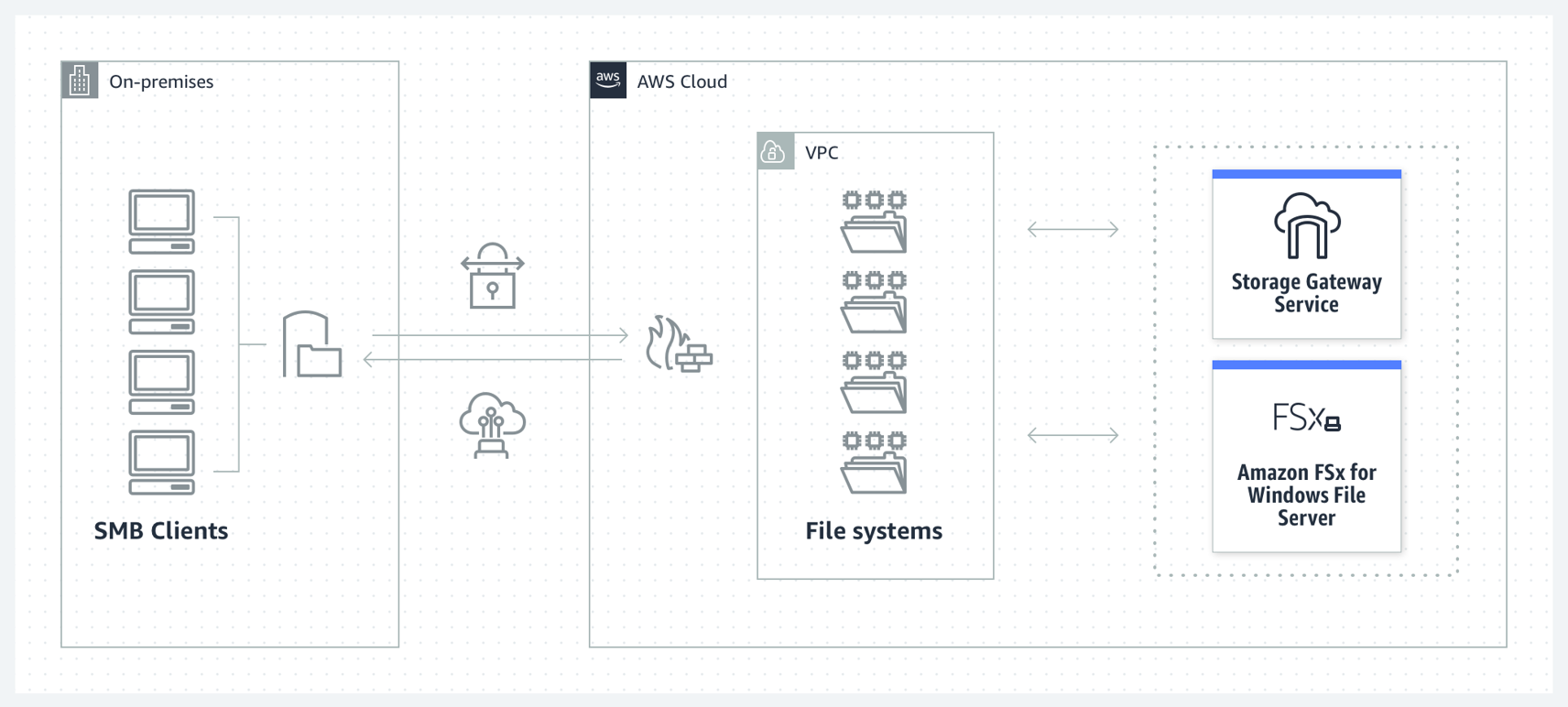 FSx File Gateway는 SMB 프로토콜을 지원하여 클라우드의 윈도우 파일서버를 통해 파일공유를 원할하게 접근할 수 있다.
