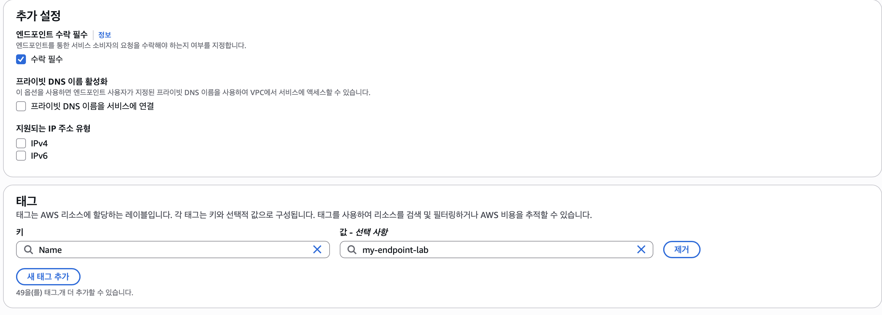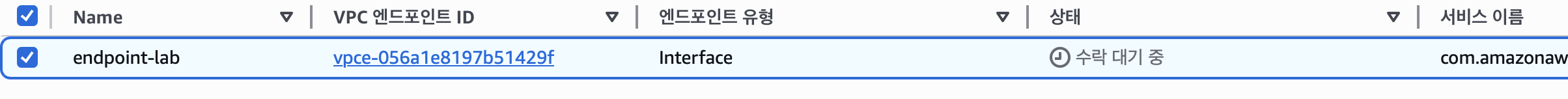 엔드포인트를 생성하고 나면 수락 대기 중이라고 뜨는데 이부분을 엔드포인트 서비스에서 수동으로 수락을 해주면된다. 만약 이부분이 귀찮다면 엔드포인트 서비스를 생성할 때 엔드포인트 수락 필수를 체크 해제하면 된다.