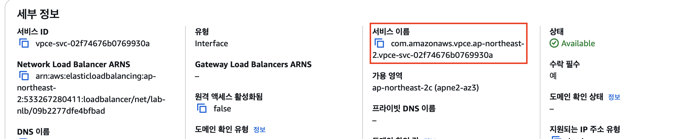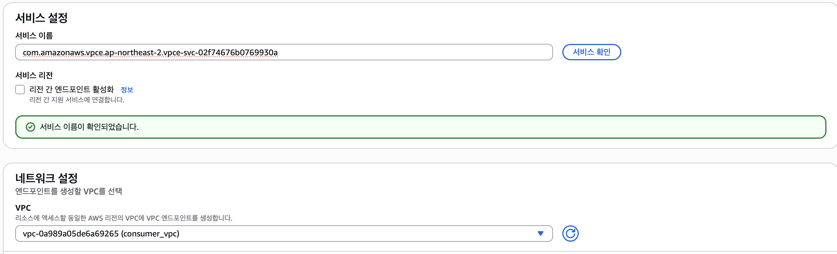 아까 복사해둔 서비스 이름을 적은다음 서비스 확인을 눌러주면 됨 또한 vpc는 당연히 서비스를 사용할 vpc를 선택해주면 된다.