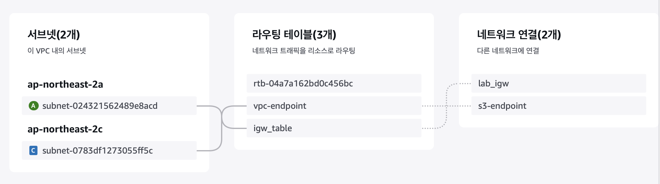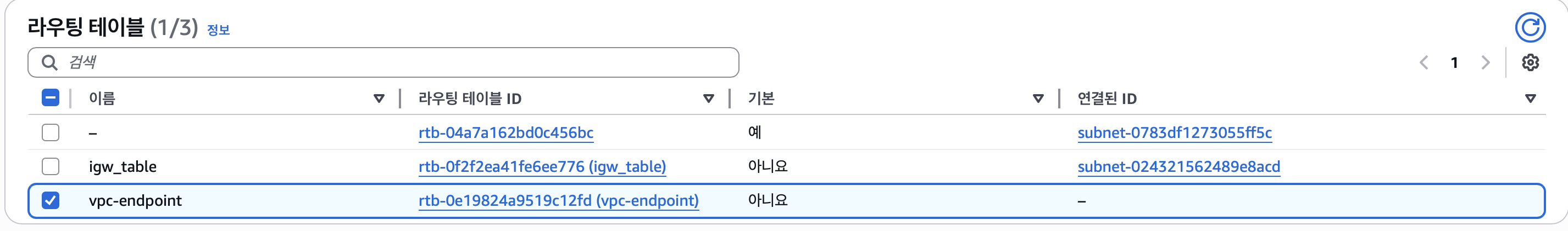 사진에서 보면 vpc-endpoint는 연결된 ID 즉 연결된 서브넷이 없다는 말...어떻게 보면 기초적인 실수를 함...(당연히 vpc endpoint 생성후 해당 라우팅 테이블은 서브넷에 연결해줌)