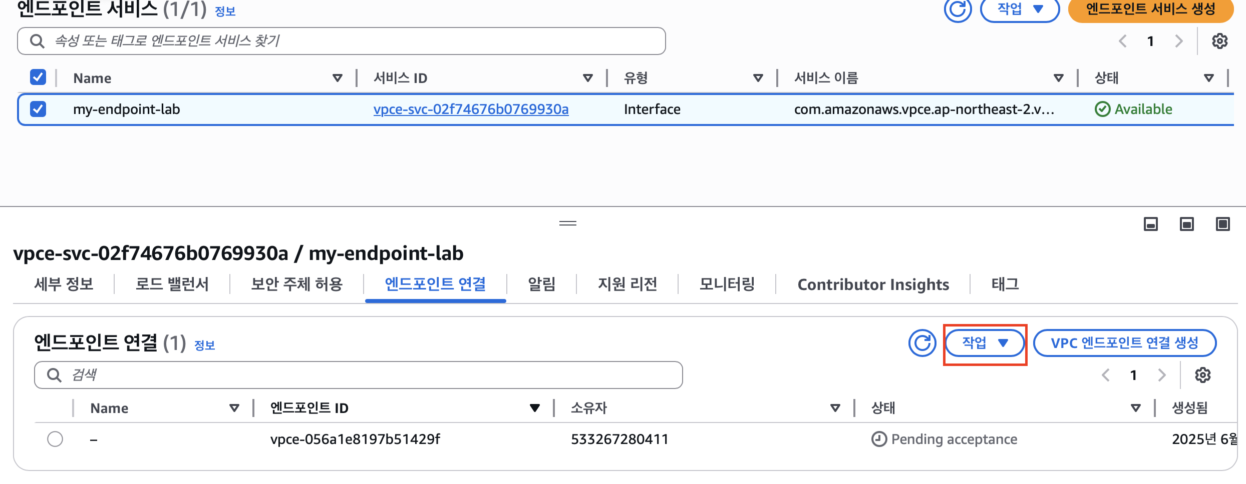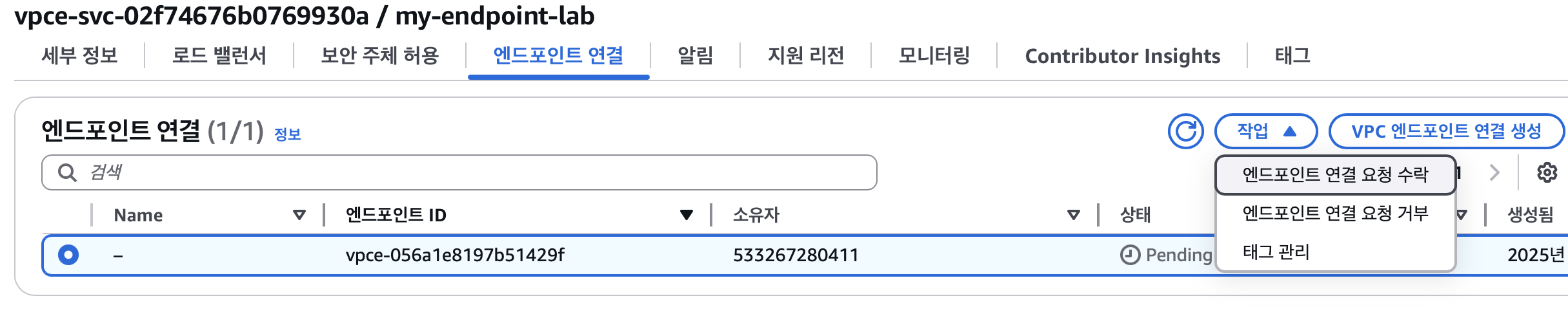 다시 엔드포인트 서비스로 돌아와 엔드포인트 연결로 들어가면 수락 대기중인 엔트포인트 연결을 확인할 수 있다.
