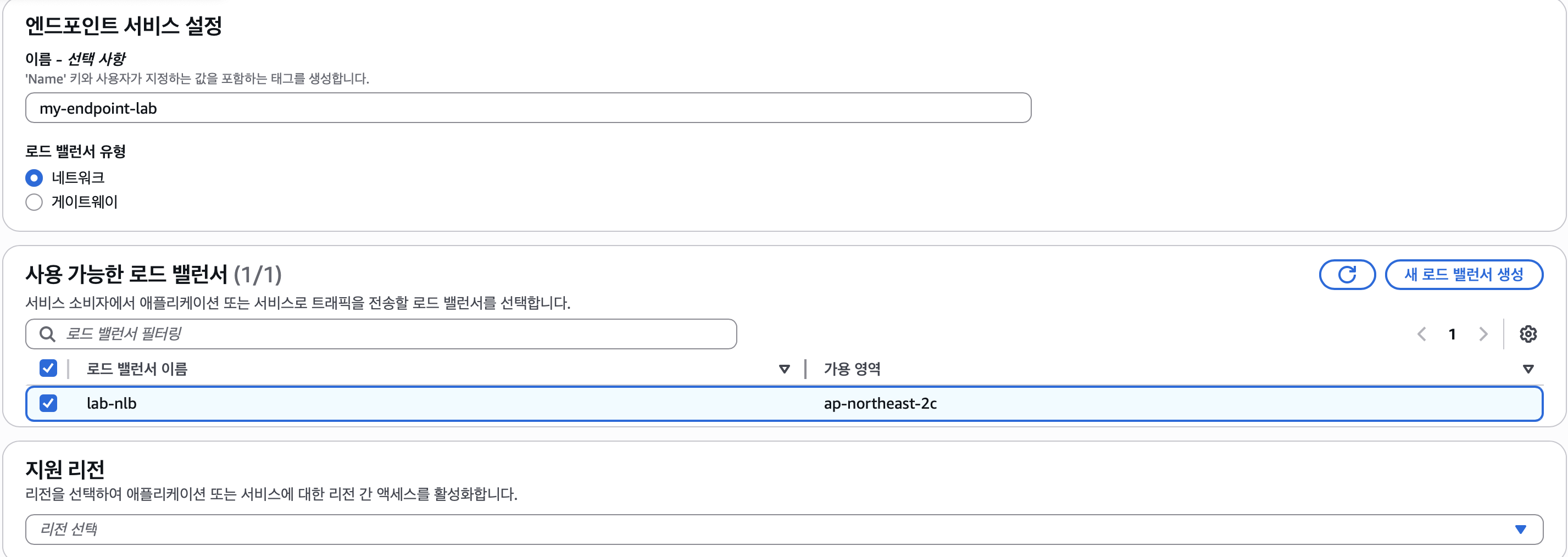 엔드포인트 서비스이름, provider에 있는 로드밸런서를 선택해준다.