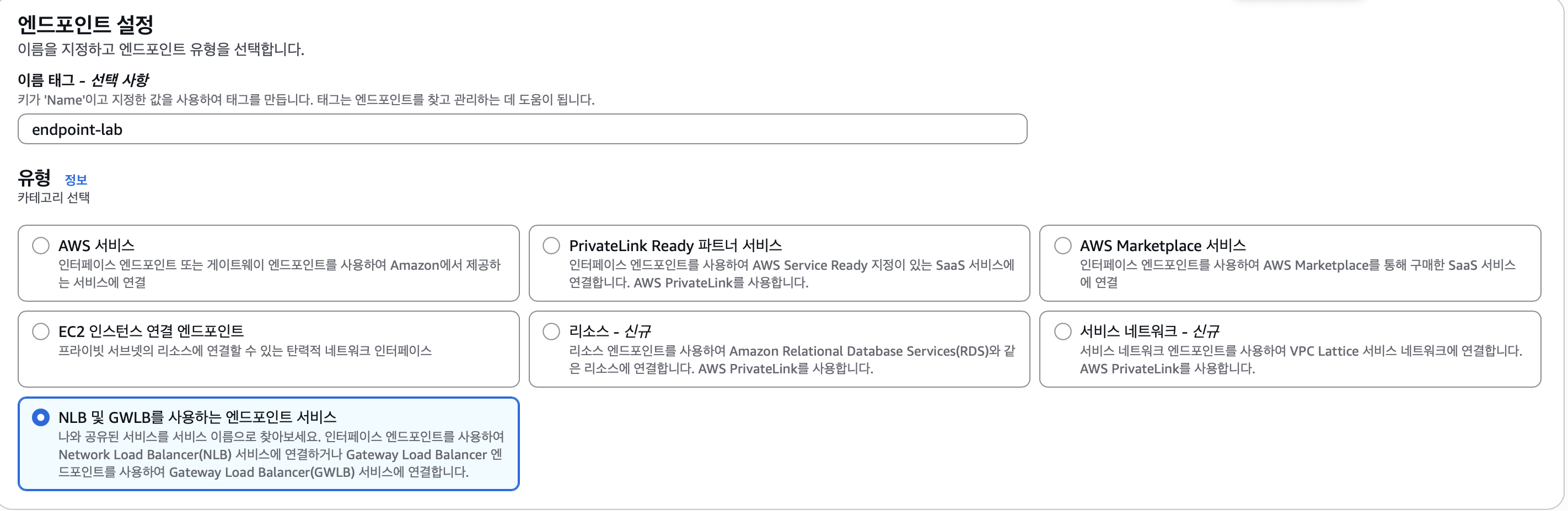 엔드포인트로 마찬가지로 이름을 설정한 다음 유형을 NLB 및 GWLB를 사용하는 엔드포인트 서비스로 설정해준다.