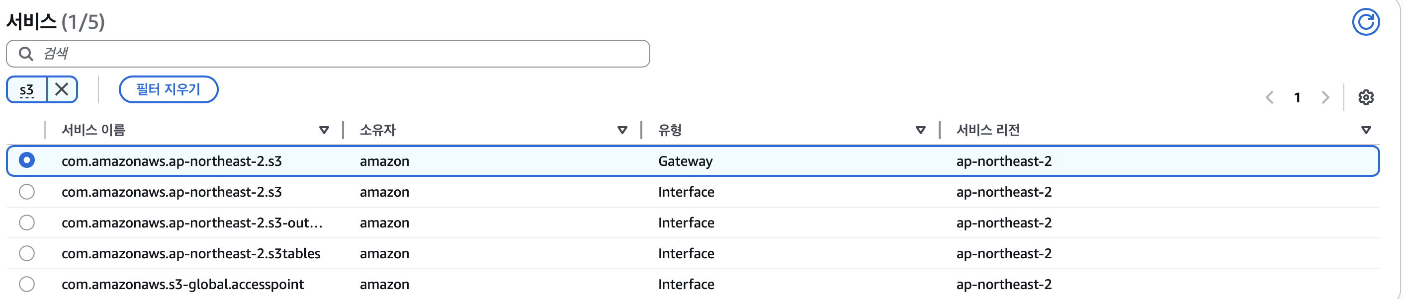 다음으로 서비스에 우리는 S3에 연결할예정이므로 S3를 입력해서 인터페이스가 아닌 Gateway 유형을 선택해줌