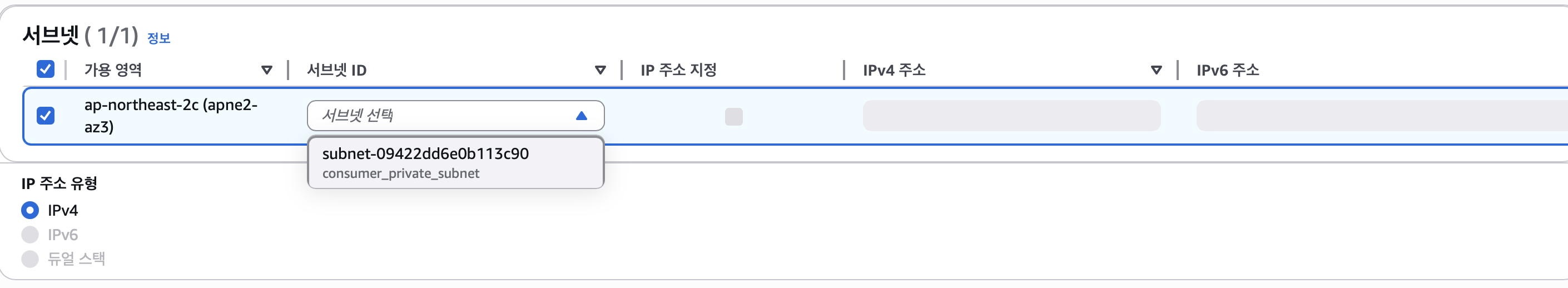 서브넷도 선택해줘야하는데 나는 consumer vpc에 private 서브넷에 있는 ec2로 웹서버를 호출할 예정이기 때문에 해당 서브넷을 선택해줬다.