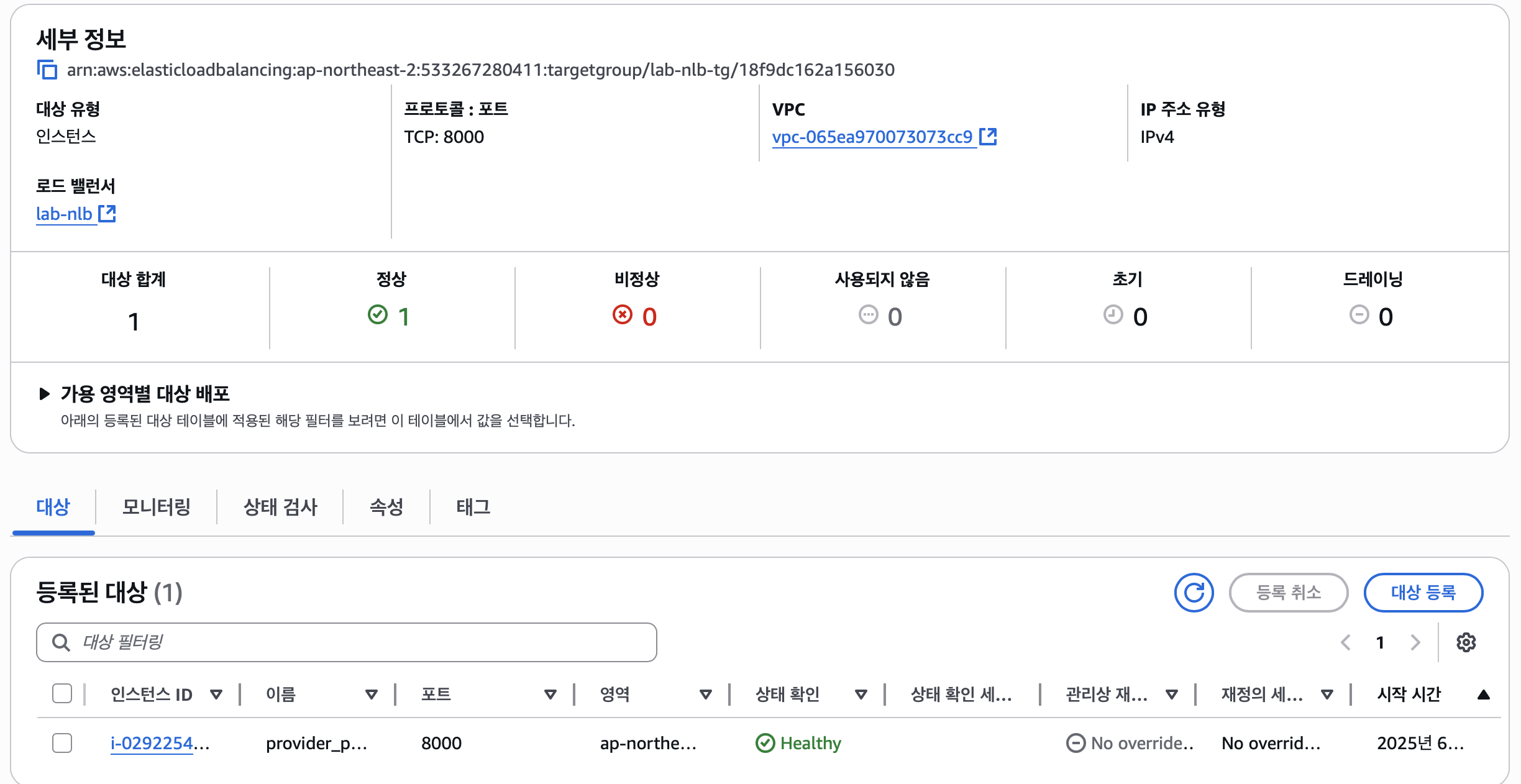 또한 NLB의 타겟그룹에 대상을 provider의 private 서브넷에 ec2(웹서버)를 등록하였다.(참고로 NLB는 내부 로드밸런서이다.)