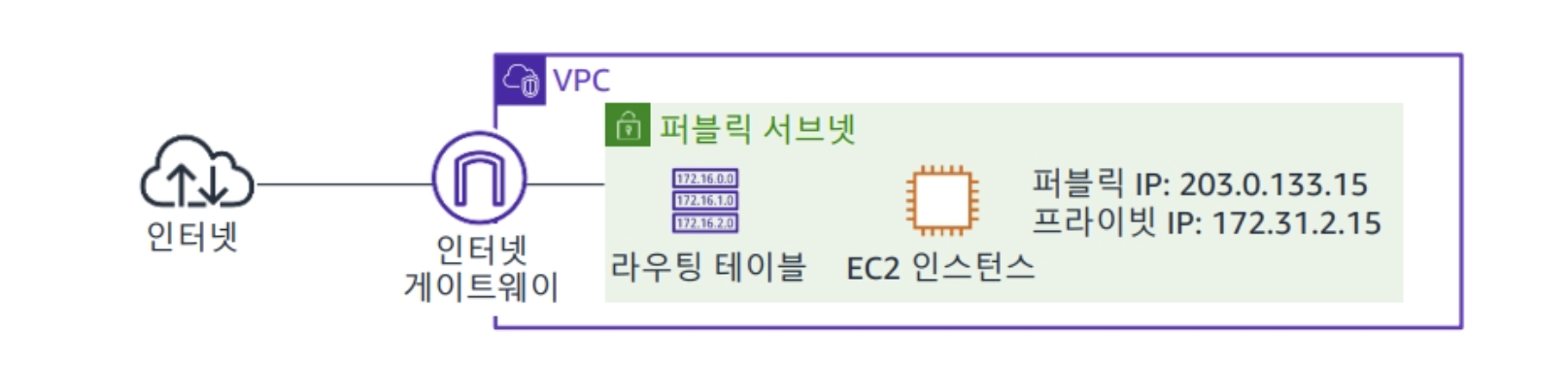 이제 퍼블릭 서브넷을 알아보겠다. 사실 프라이빗 서브넷은 그냥 Public IP가 부여되지 않는 공간이라서 특별한 점이 없는 서브넷이다. 퍼블릭 서브넷은 인터넷이 통하는 양방향으로 트래픽 흐름을 허용하게된다. 하지만 퍼블릭 서브넷을 구성할려면 IGW, 라우팅 테이블, Public IP 와 같은 요소가 필요하다.