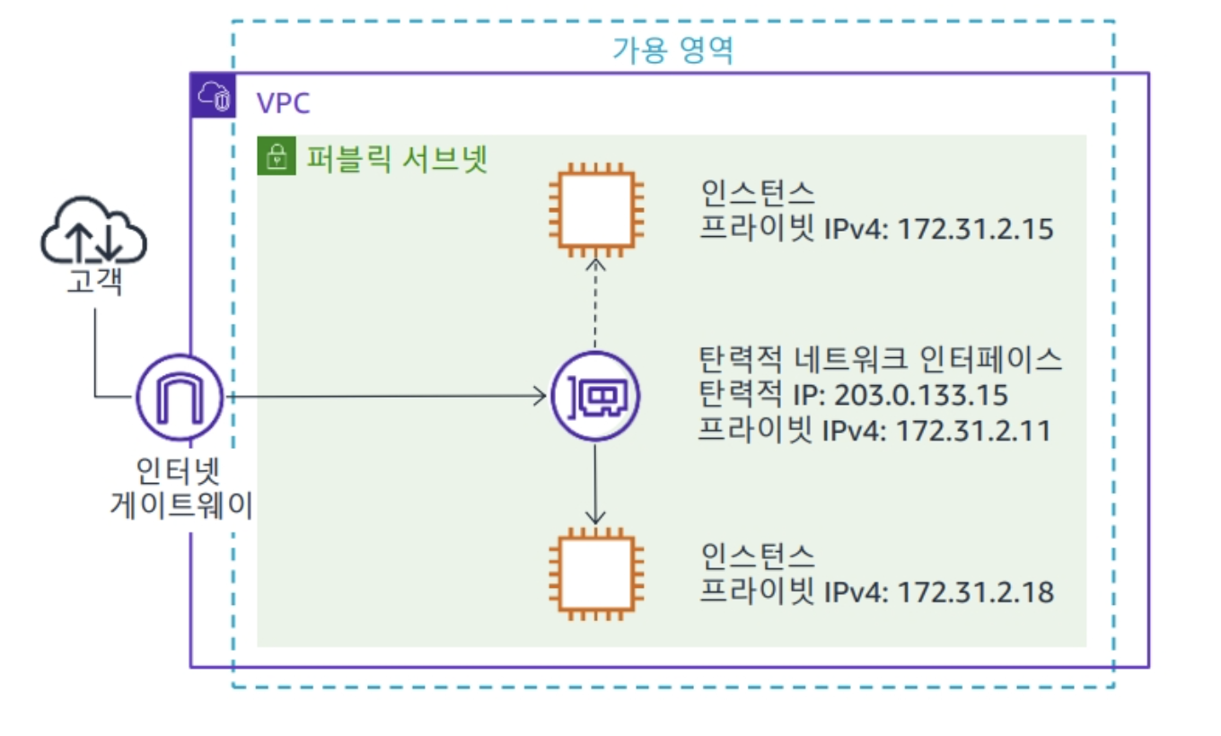 탄력적 NIC는 가상 네트워크 카드를 나타내는 논리적 네트워크 구성 요소이다. 다른점이 있다면 네트워크 인터페이스에 탄력적 IP 주소, Mac주소, 프라이빗 IP 주소를 유지하며 인스턴에 연결이 가능하다.