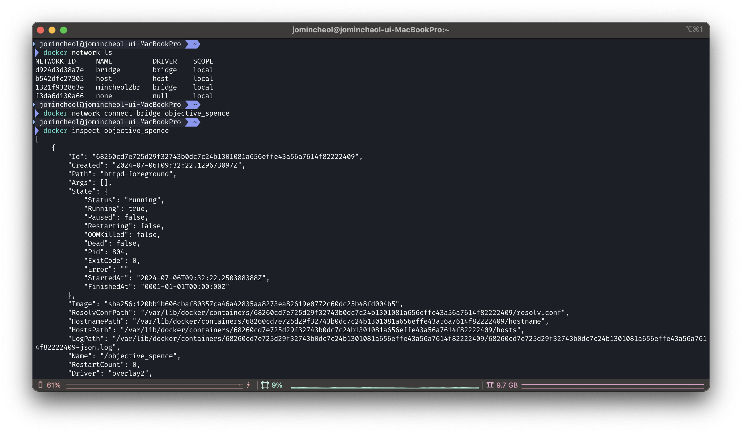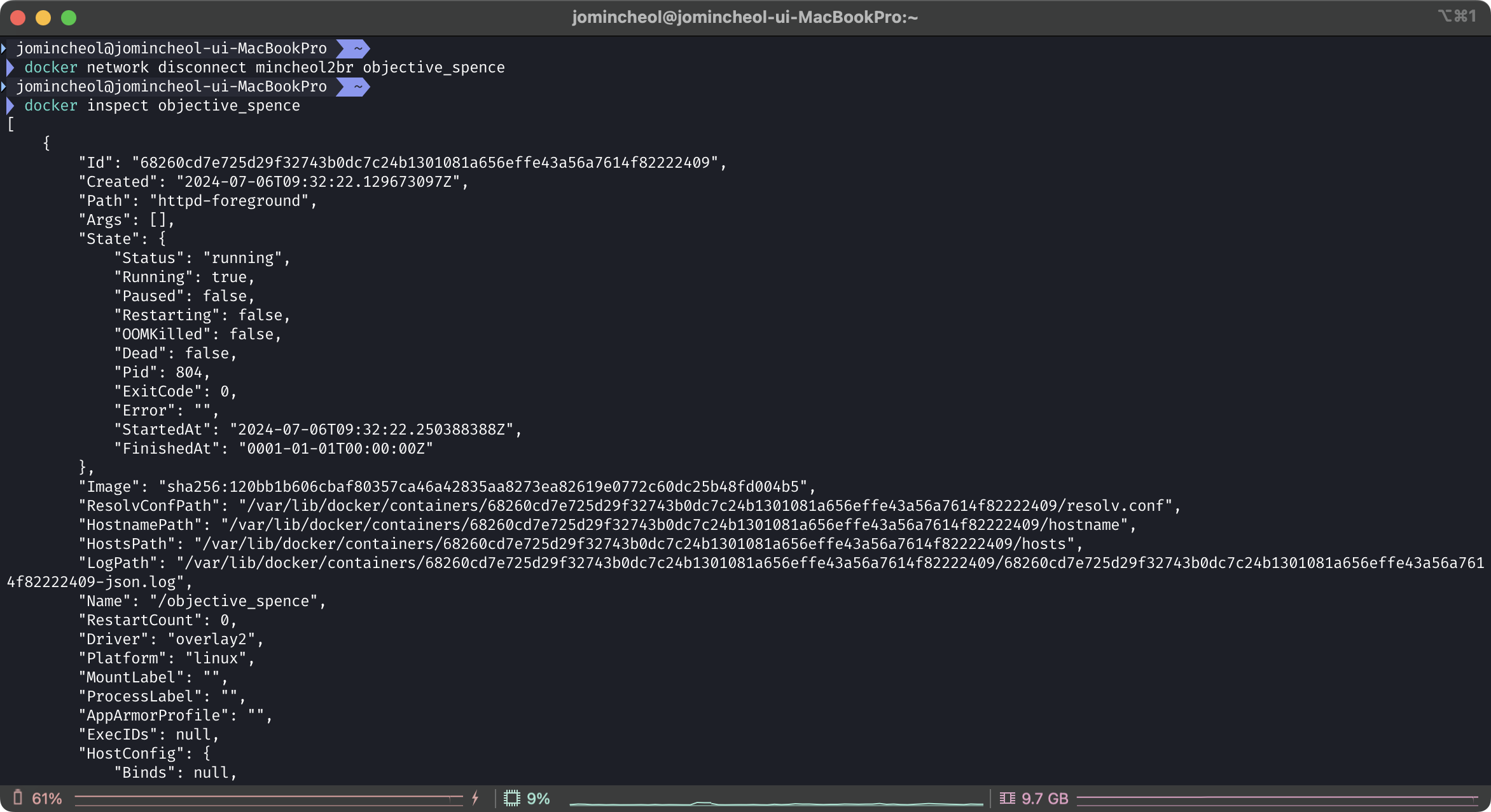 컨테이너 네트워크를 docker0로 변경할려먼 그전 mincheol2br 네트워크를 해제하고 connect 명령어를 사용하여 docker0에 연결 해주면 네트워크가 설정되게 된다