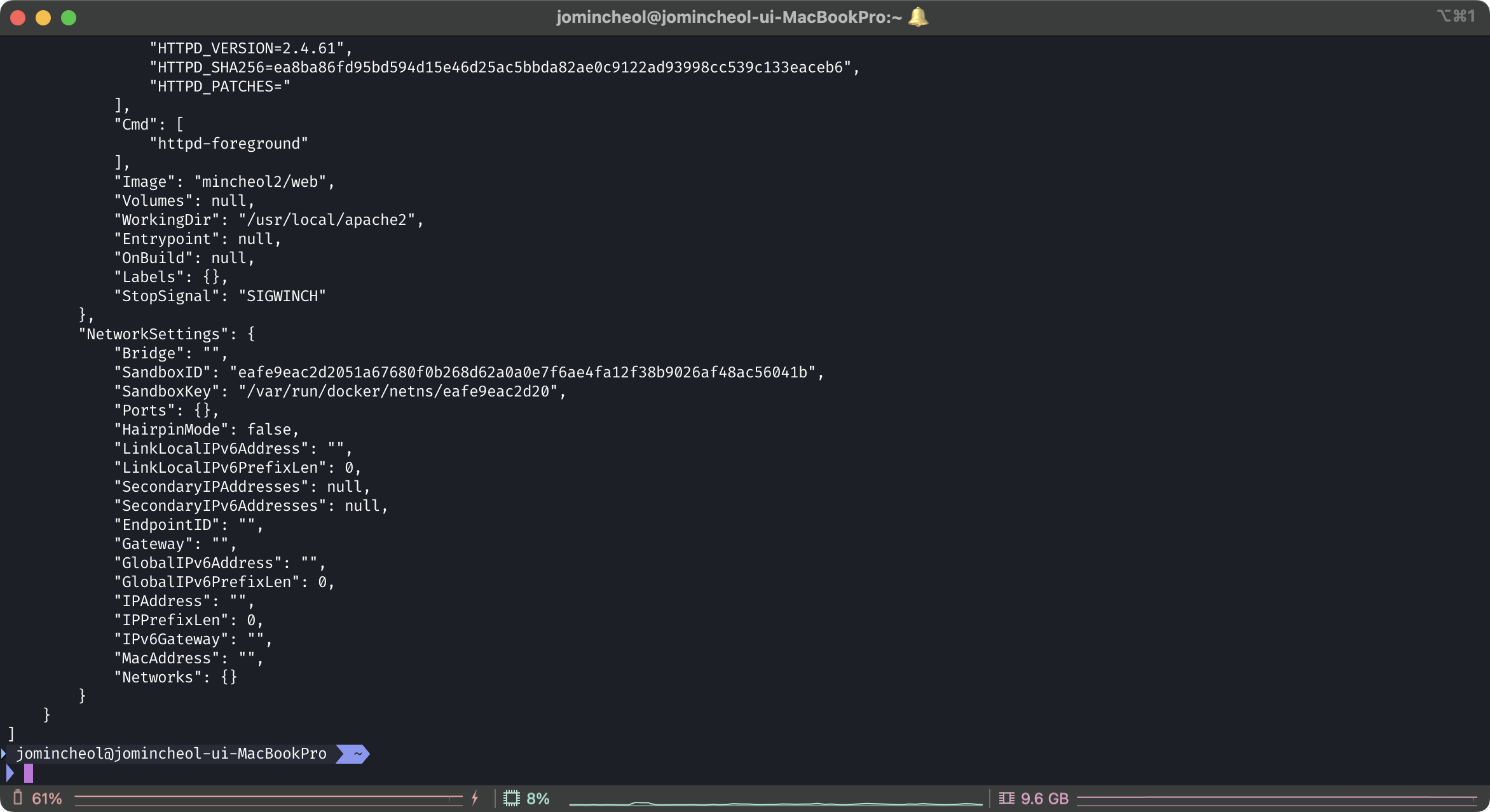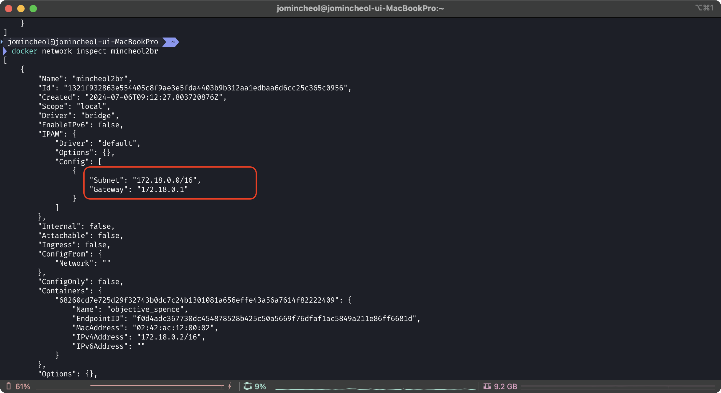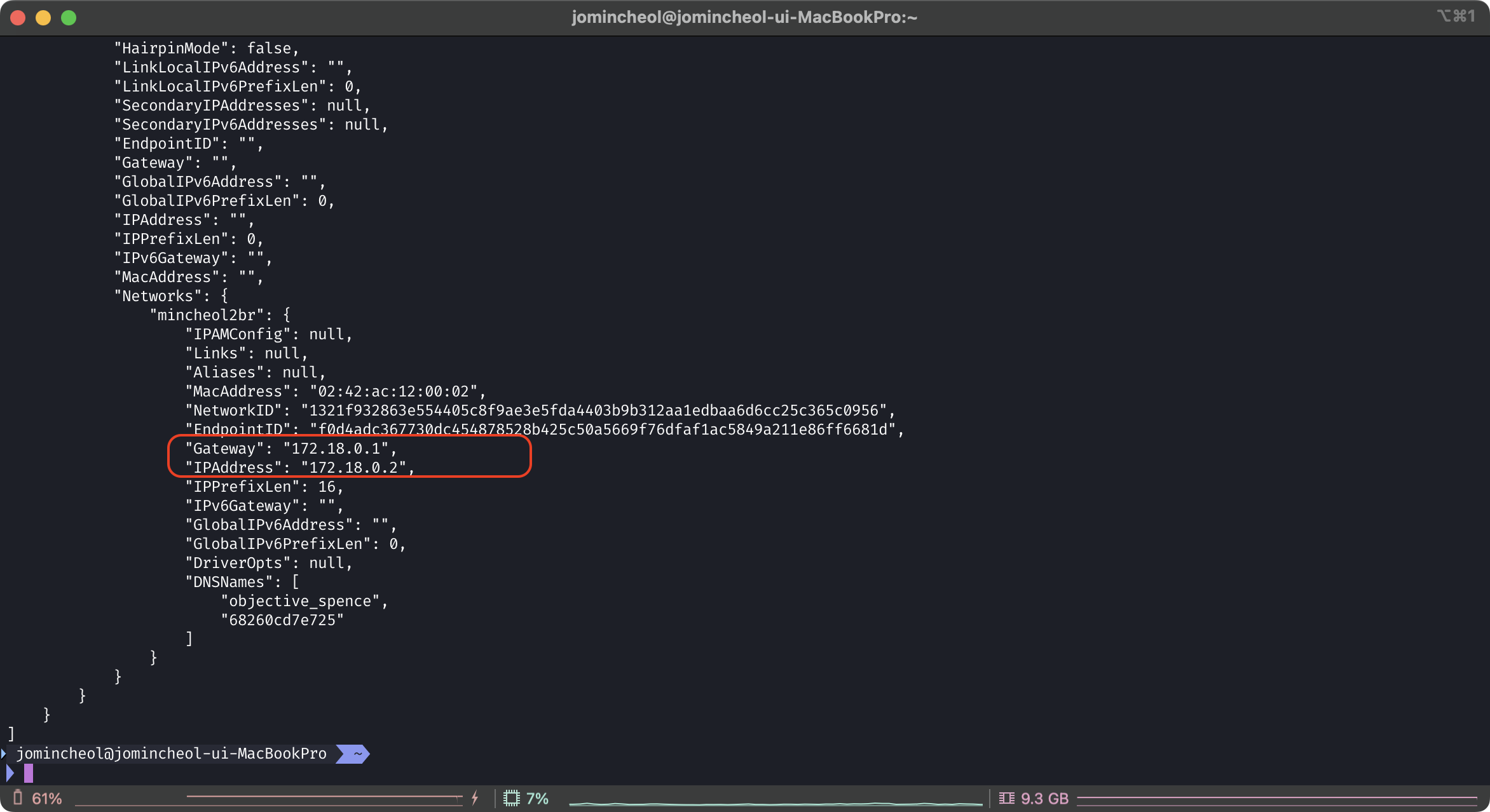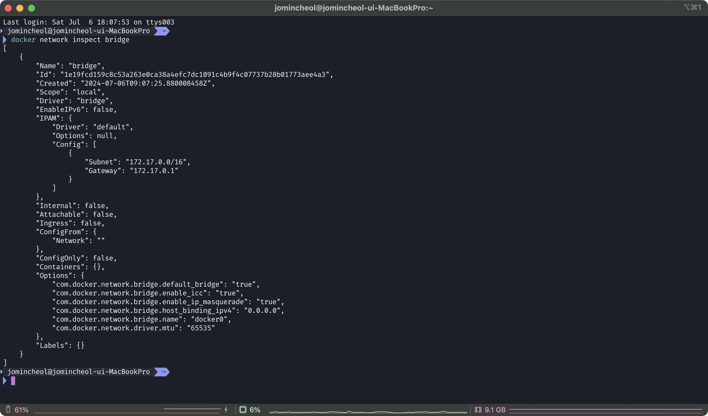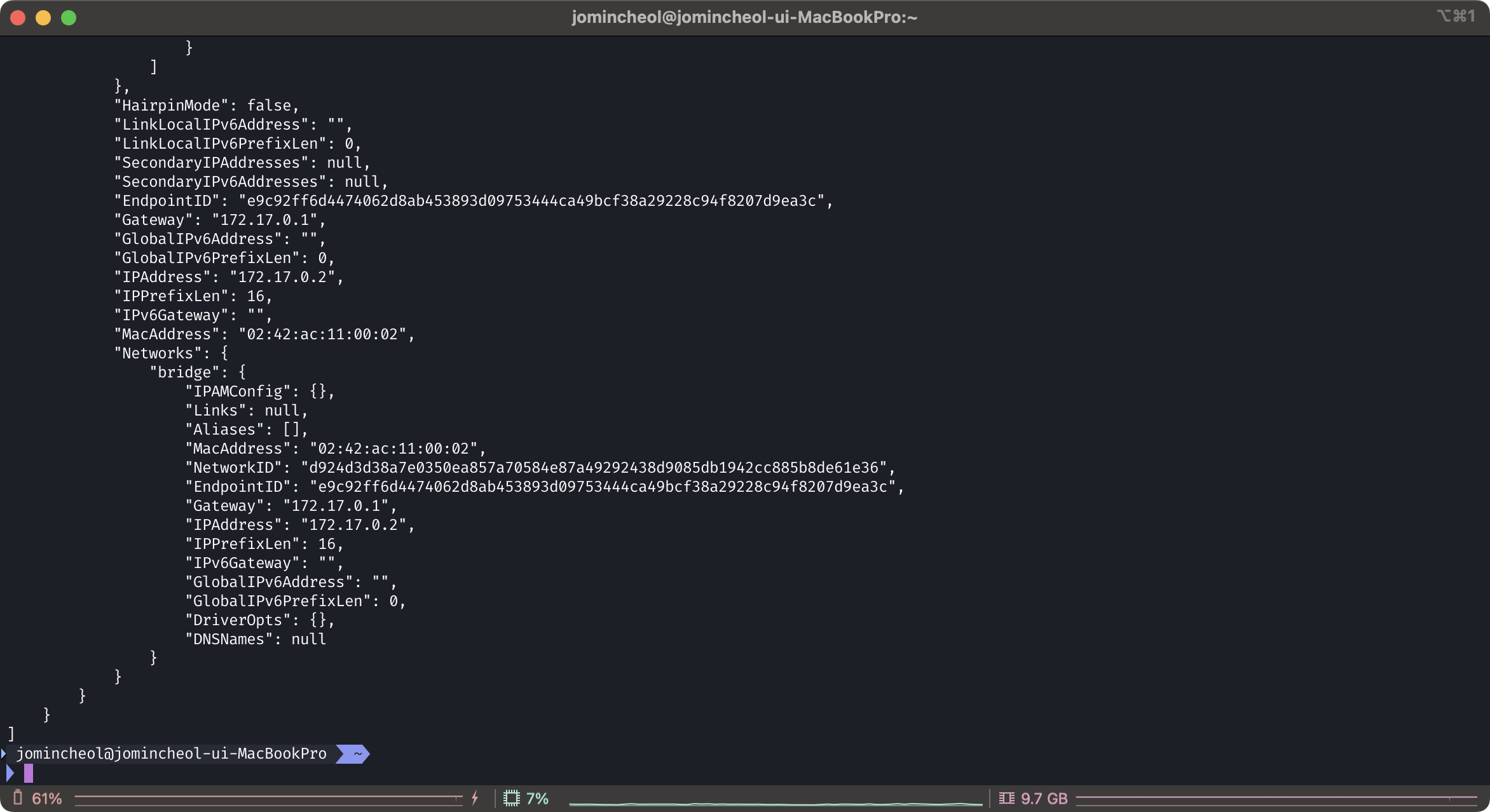 설정값을 보게 된다면 172.17.0.0/16 네트워크에 게이트웨이는 172.17.0.1로 설정이 되어있는 모습을 확인할 수 있다