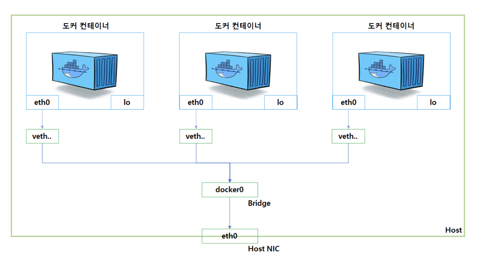 도커는 컨테이너를 생성할 때마다 컨테이너에 veth(Virtual Ethernet Interface)를 생성하게 된다. 또한 이 컨테이너에 부여되는 IP는 내부망에서만 사용할 수 있는 사설IP 대역이다. docker0는 각 veth 인터페이와 바인딩 되어 호스트의 eth0 인터페이스와 이어주는 역할을 한다. eth0 인터페이스는 현재 호스트의 컴퓨터의 NIC이다.