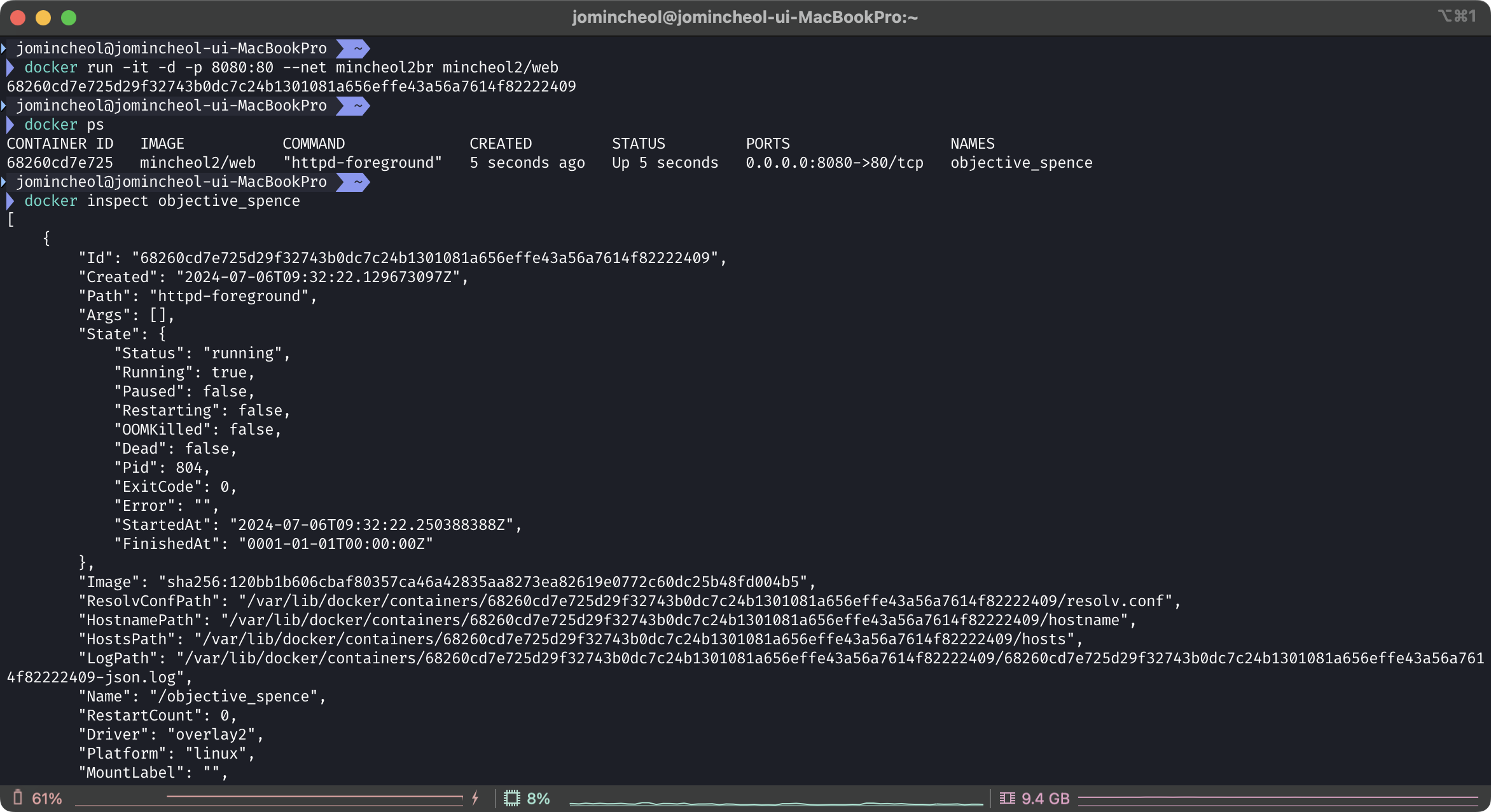 docker run 명령어를 사용해서 컨테이너를 생성하는데 --net 옵션을 더해 mincheol2br 이라는 네트워크를 이용하여 생성하라고 지정하였다