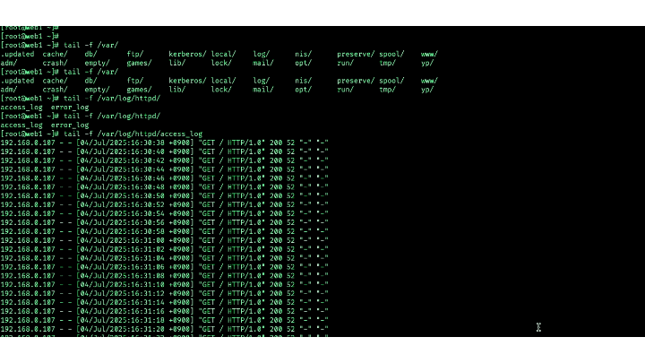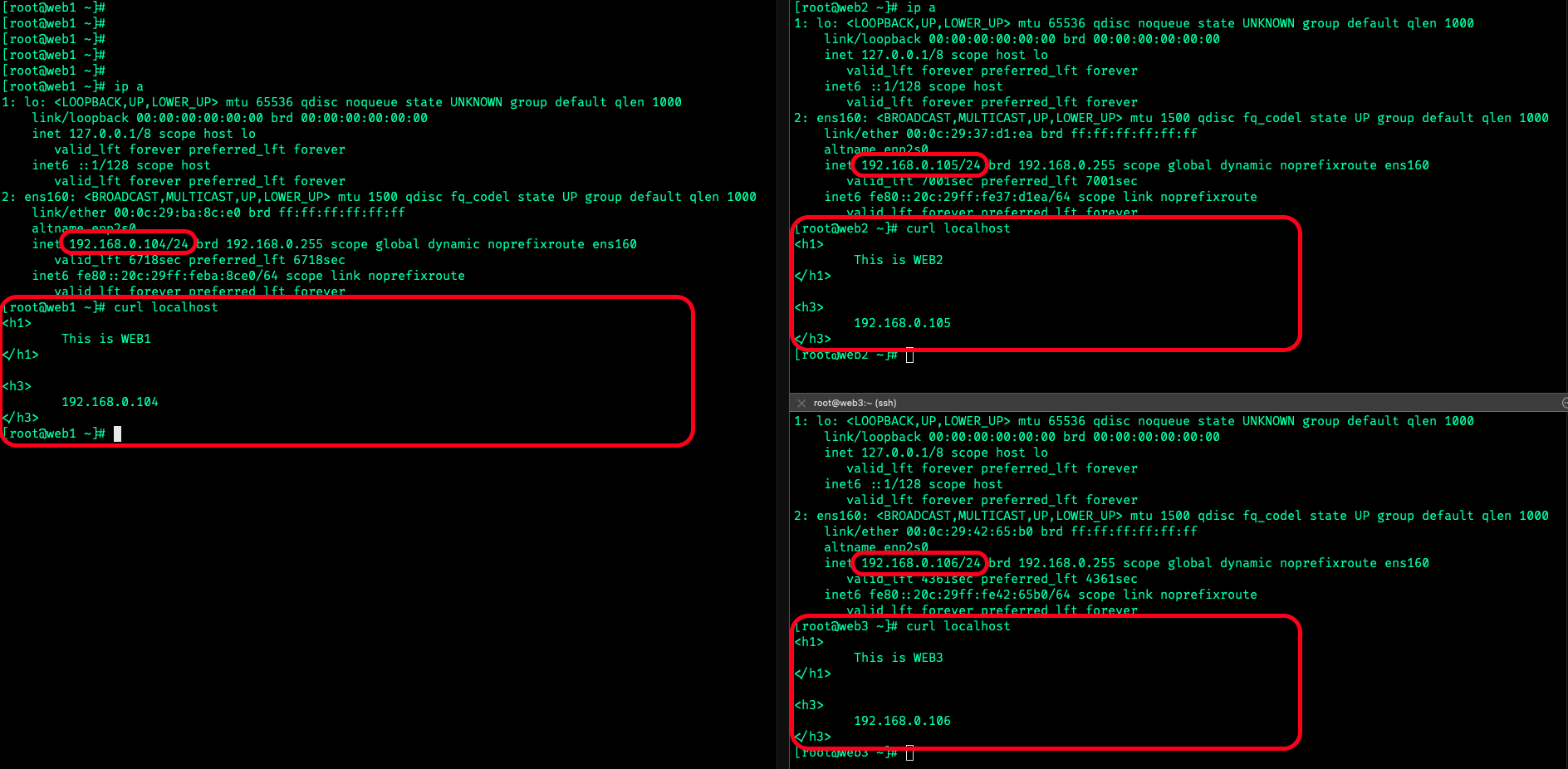 각 VM(웹서버) 에서 IP와 curl 명령어를 통해 웹서버가 잘 작동하는지 확인함.