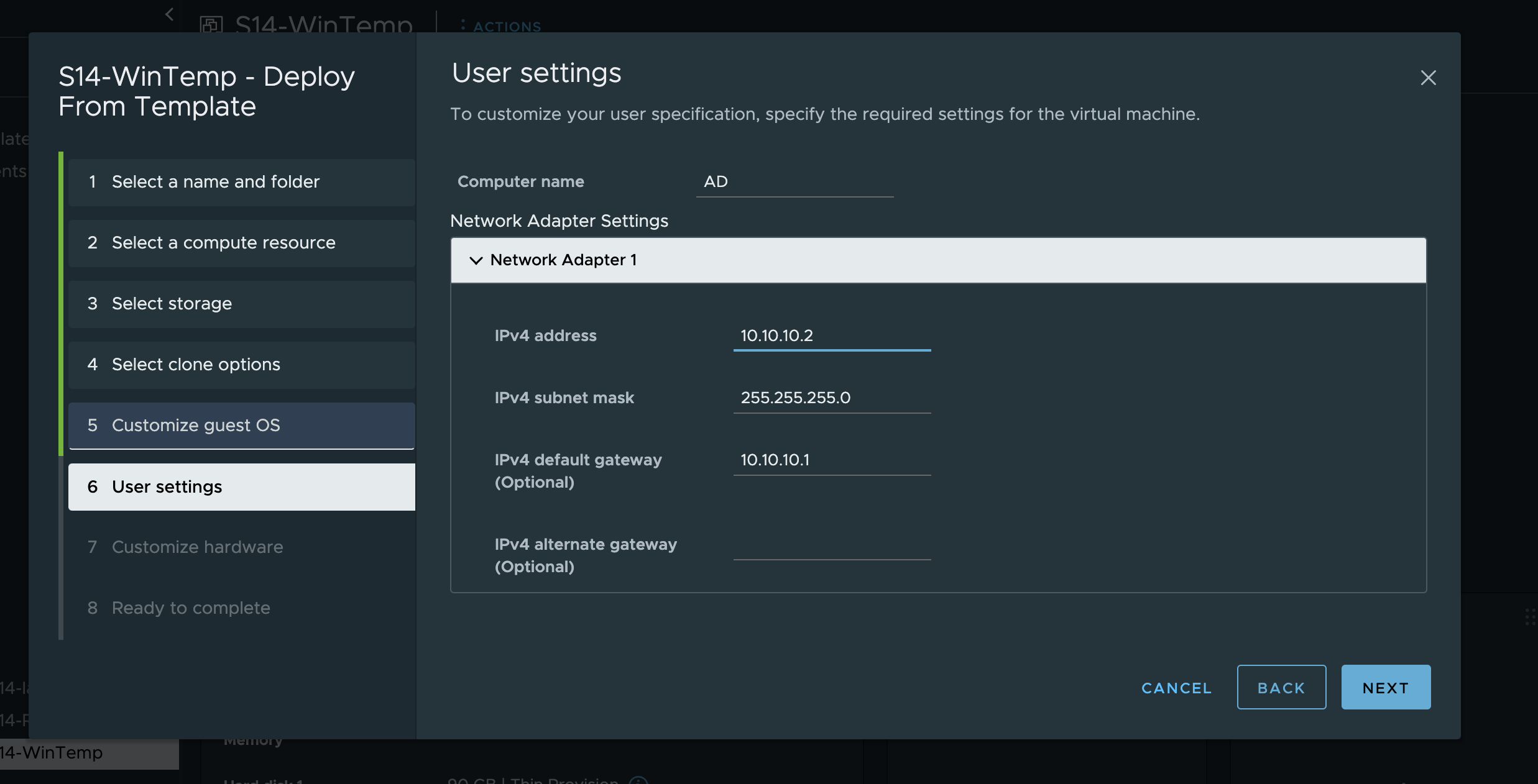 그러면 아까 설정한대로 입력을 받아야할 부분은 받게된다.VM이름을 AD라고 설정후 네트워크 설정을 해준다. vlan 10번은 10.10.10.0 네트워크 대역이다. 또한 기본 게이트웨이는 라우터에서 설정을 해주었다.