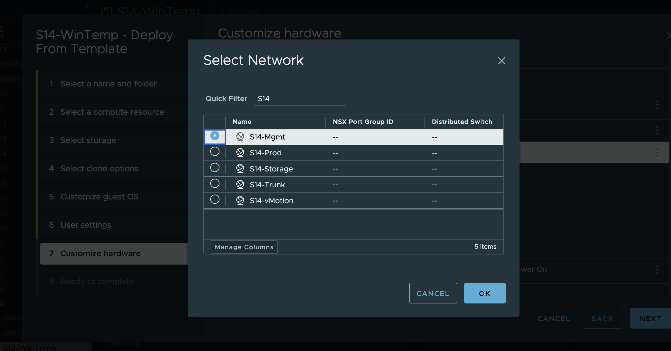 네트워크를 선택해준다. AD는 DNS 서비스를 이용할 예정이라서 Mgmt로 vSwitch 설정을 해준다.