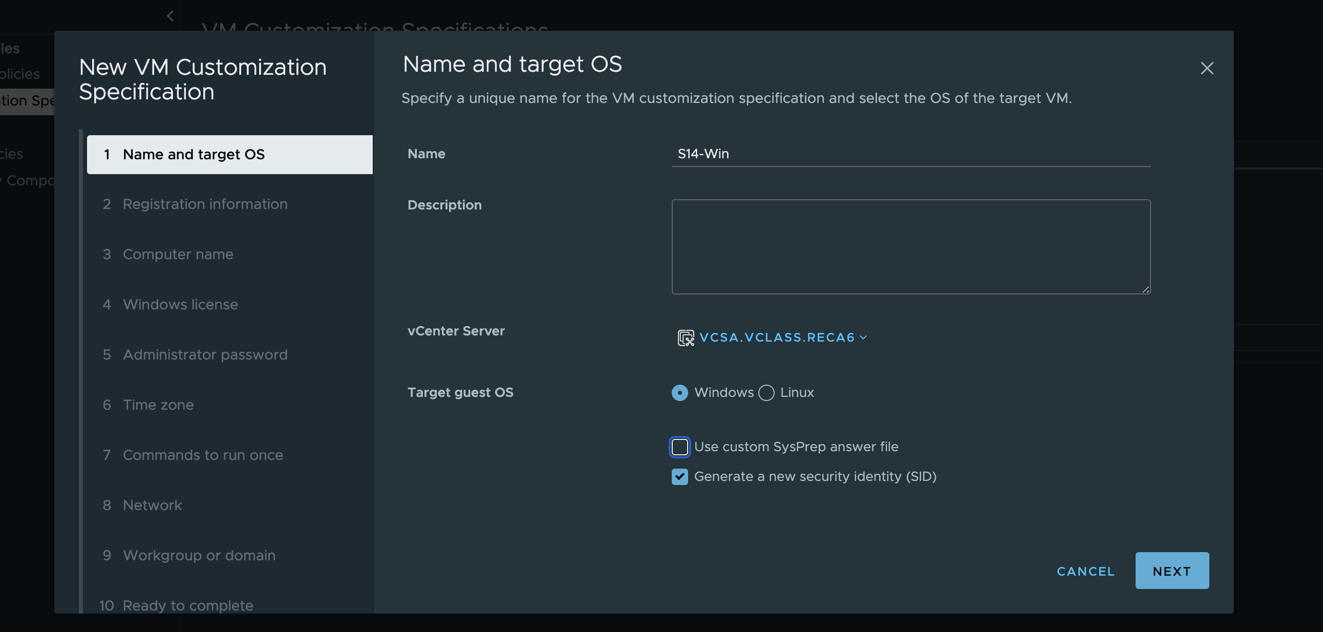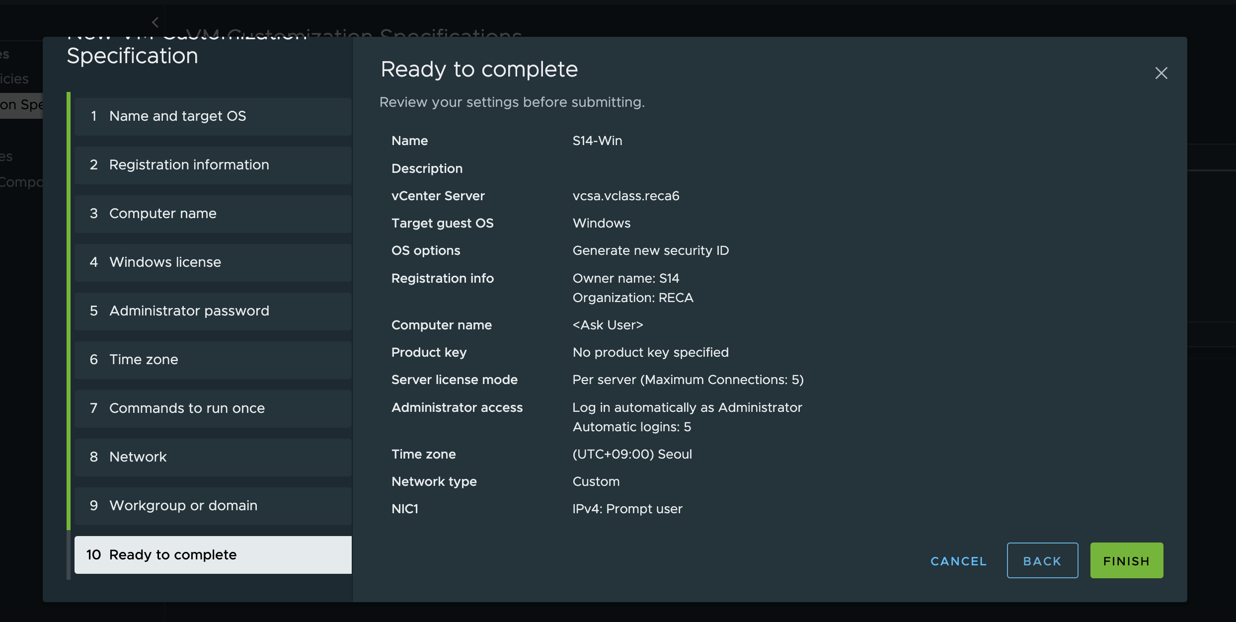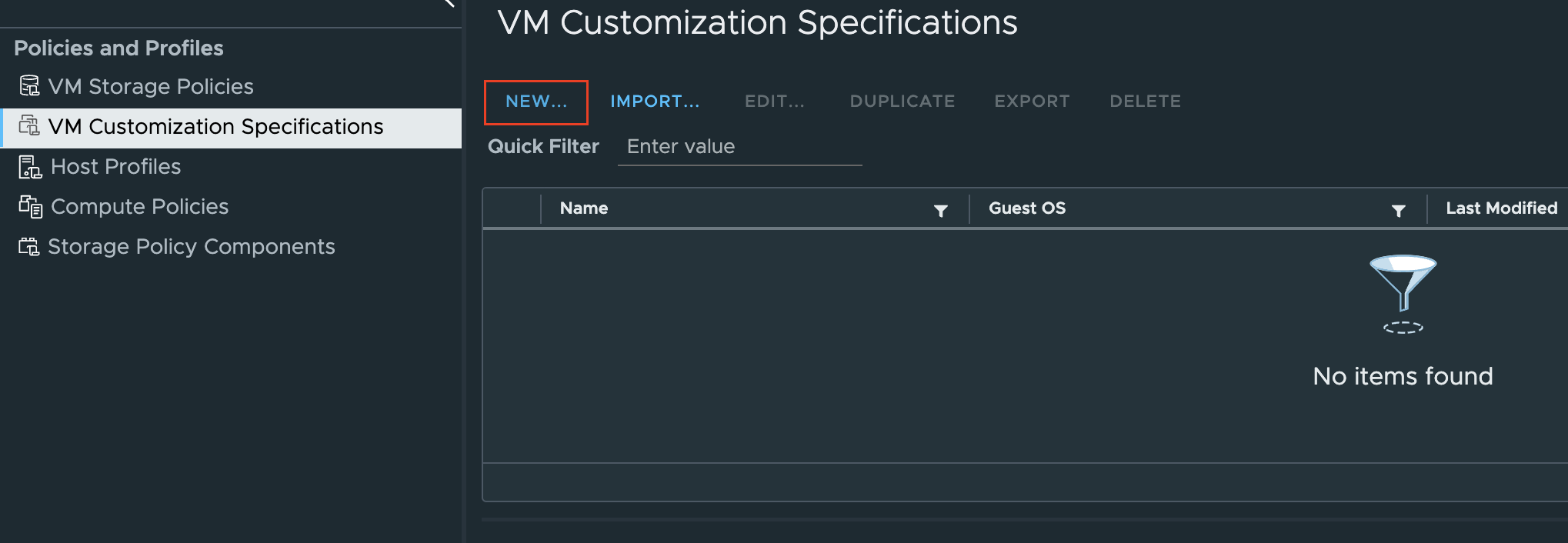 여기서 VM Customization Specifications 항목으로 이동한다. 그다음 NEW를 클릭해 생성해준다.