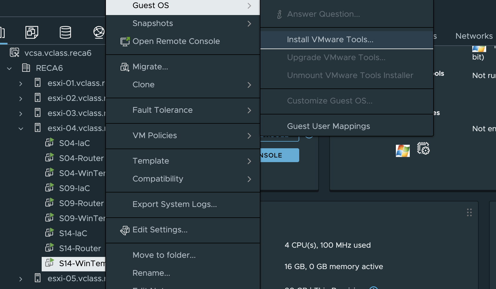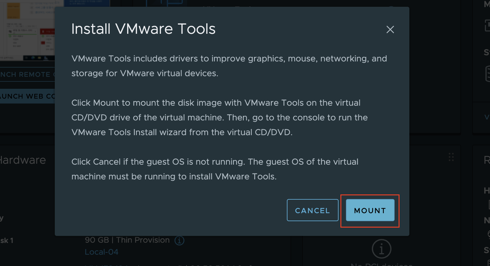 VMware tool이 필요한 VM을 우클릭 후 install VMware tools를 선택해주면 VMware 툴을 마운트 시킨다는 내용이 나오게 되는데 마운트를 해준다.