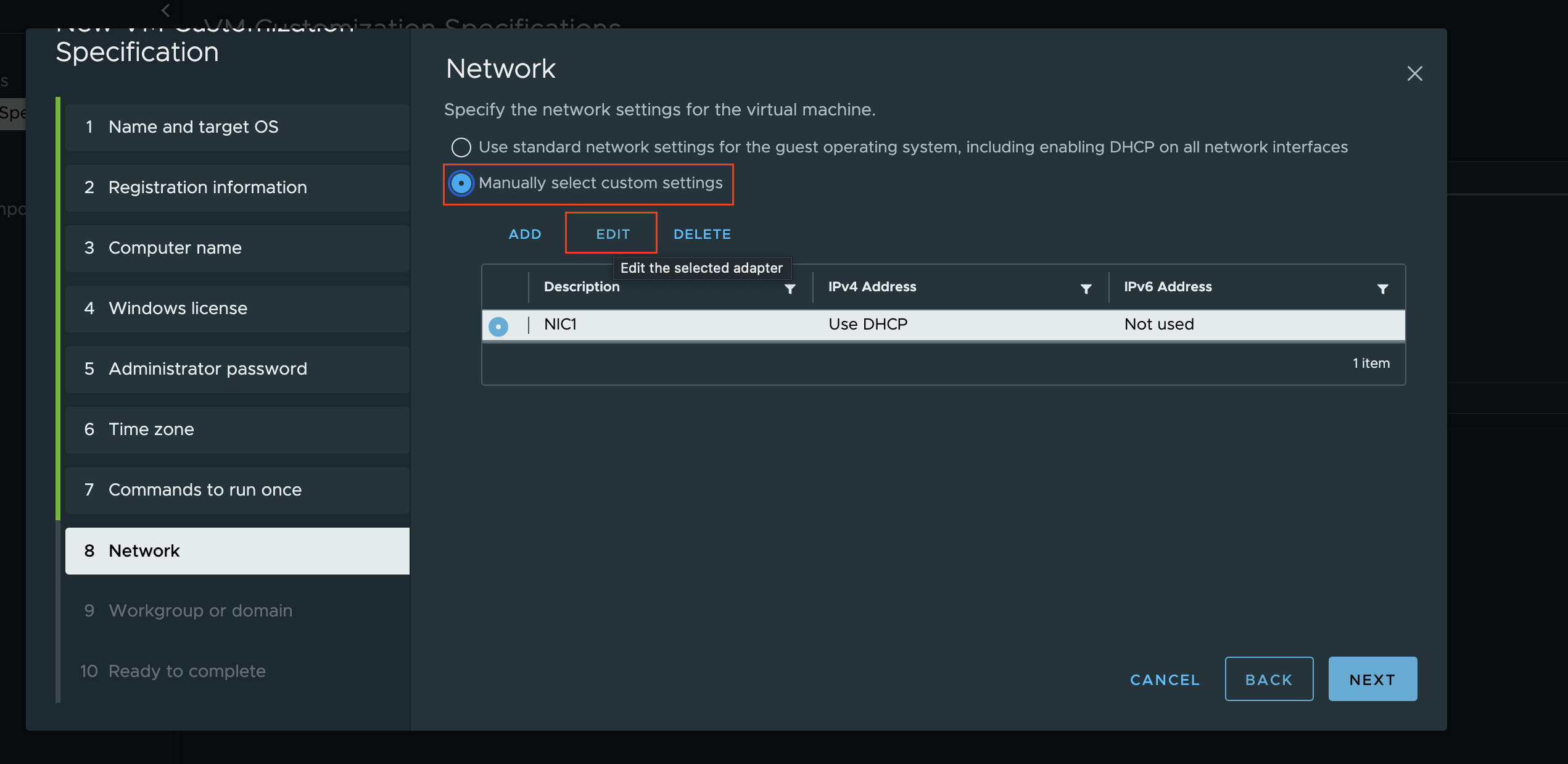 서버는 서비스를 제공해주는 제공자이다. 근데 DHCP(유동IP)로 설정이 되어있다면 항상 IP가 바뀌어 버려서 힘든 상황이 올수도 있다. 그래서 고정 IP를 설정해주기 위해 밑의 NIC1을 눌러 EDIT를 해준다