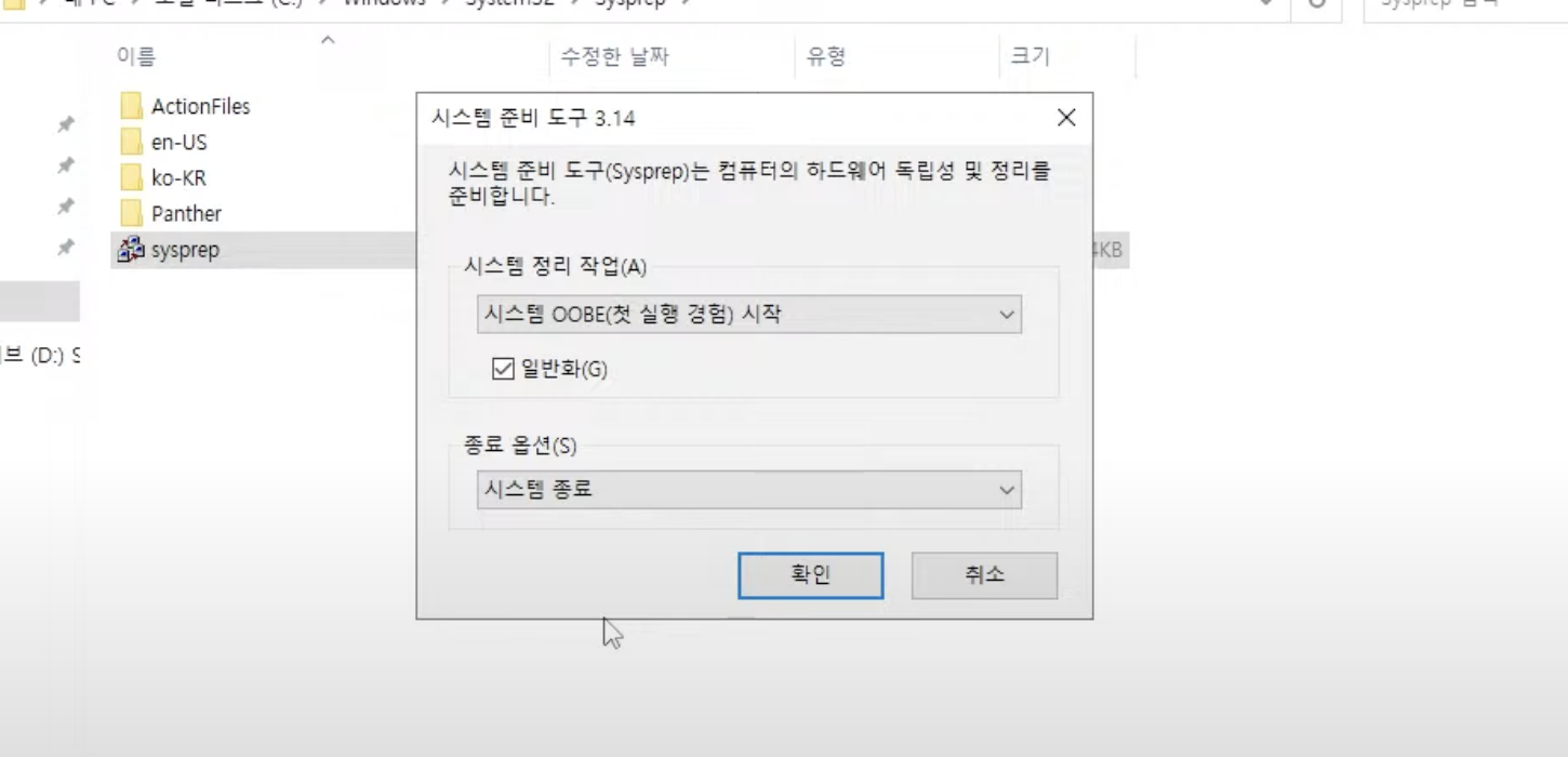 시스템 정리 작업을 OOBE로 변경해주고 종료 옵션을 시스템 종류로 바꿔주고 실행시켜준다.