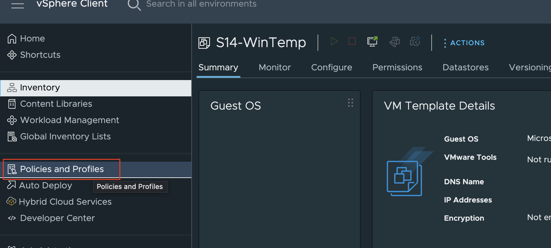 VM이름과 생성될 폴더를 선택해주고 실제로 자원을 사용할 물리서버를 선택해주고 사용할 저장소도 선택해주면되는데 여기서 문제가 있다. 현재 템플릿 화만 진행했지 실질적으로 설정값들은 들어가지 않았다. vSphere에서는 템플릿을 만들게 되면 Policy(정책)을 만들어서 선택해 줄 수 있다. 실제 값들은 정책에 들어가게된다.