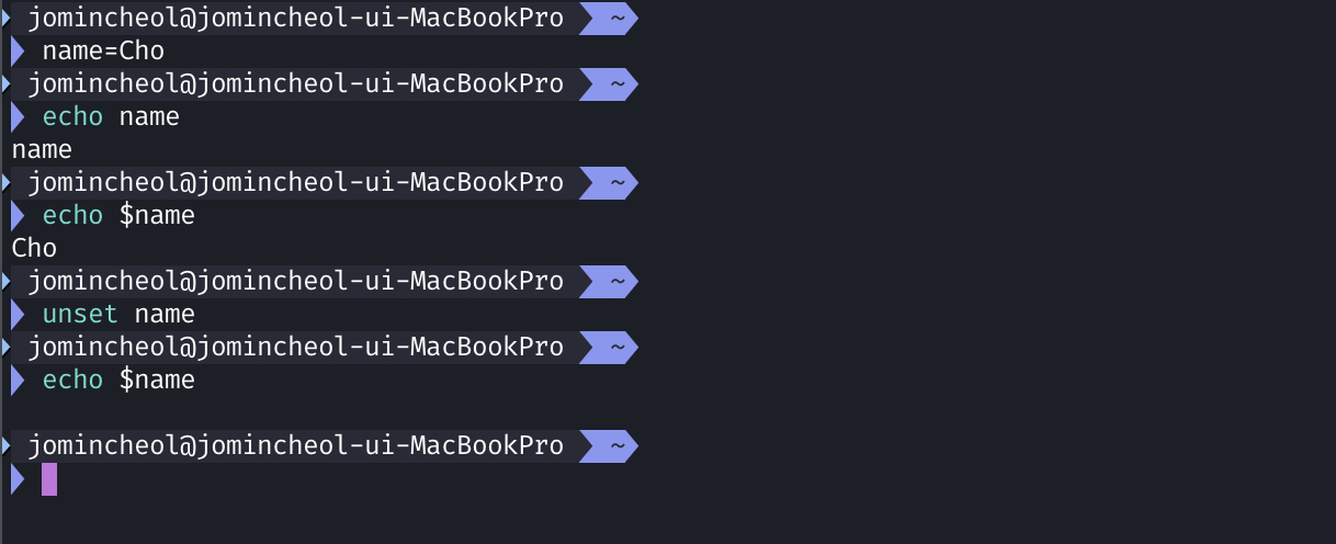 $ name=Cho # name이라는 변수에 Cho 값을 저장