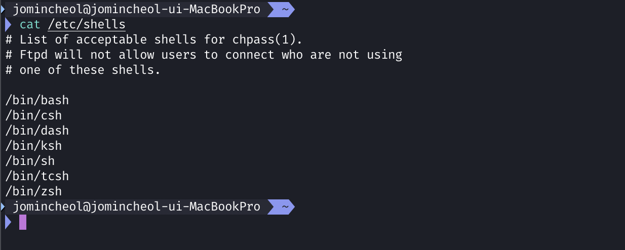 또한 사용할 수 있는 쉘들은 /bin/shell파일에 정의 되어 있다.