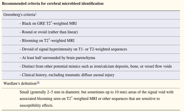 또한 Wardlaw의 정의에 따르면 T2 MRI 또는 susceptibility effect에 민감한 다른 sequence에서 볼 수 있는 관련된 blooming이 있는 신호 공백의 작은 영역으로, 일반적으로 2~5mm, 최대 10mm의 작은 영역을 의미한다.