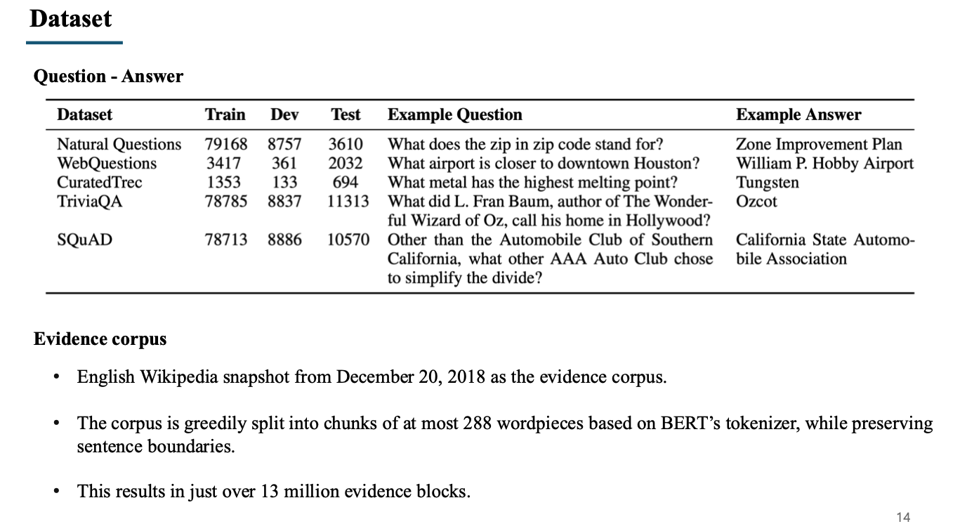 - 사용된 dataset은 5가지이며, TriviaQA, SQuAD와 같은 데이터셋은 기존에 evidence도 pair로 존재하지만 evidence는 사용하지 않고 question과 answer pair로만 사용함.