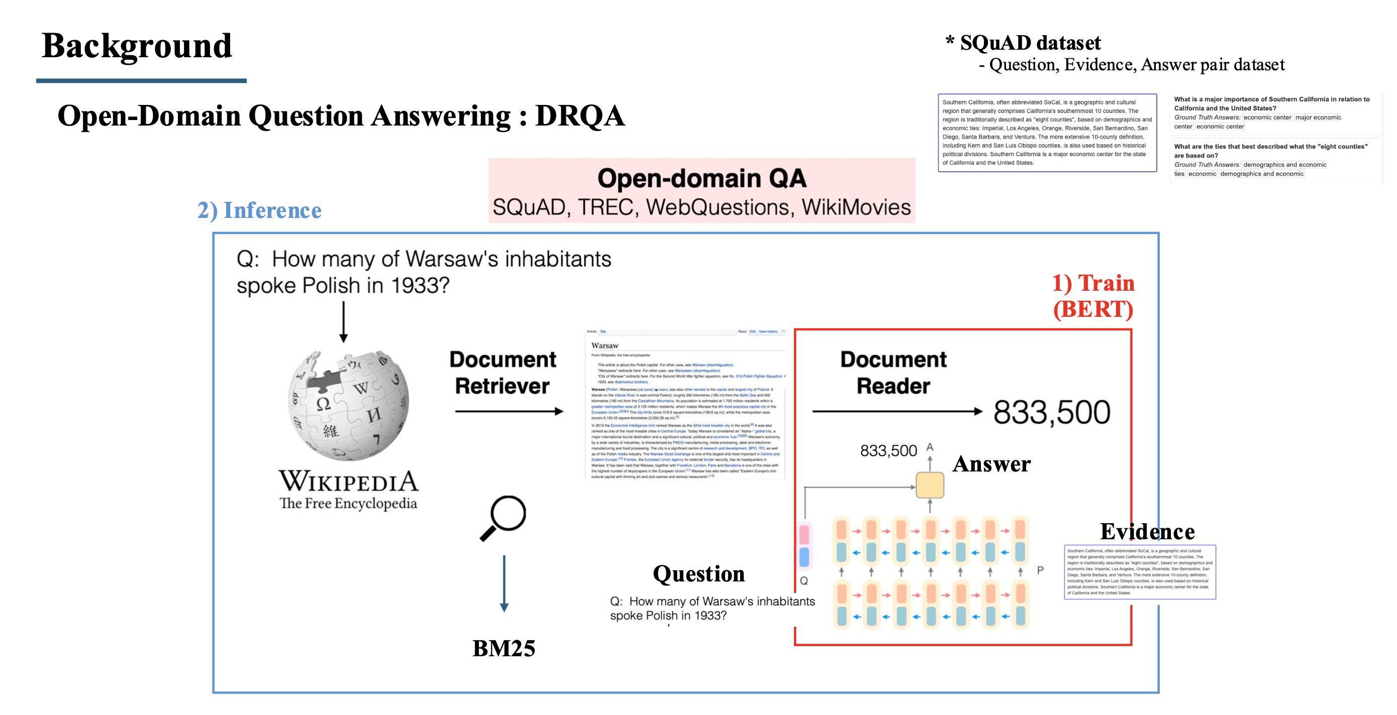 - 학습은 Reader만 학습을 진행하고, Question과 evidence를 입력으로 받아 answer를 찾아주는 Question answering task로 supervised learning을 진행.