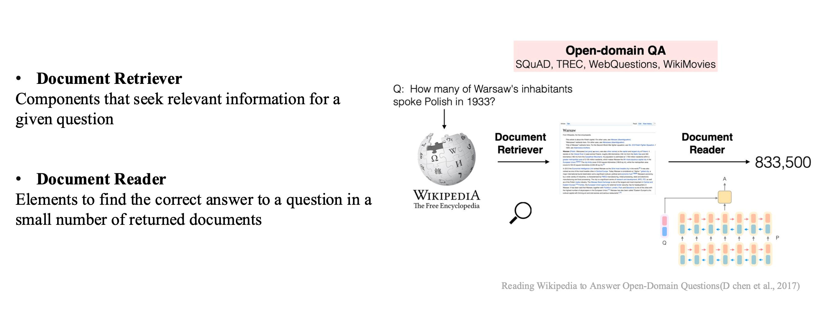 - QA task와 달리, 사용자가 질문만 입력을 하면, 거대한 코퍼스(ex. wikipedia)에서 정답이 있는 문서를 찾아 문서 내에서 정확한 정답을 return해주는 task