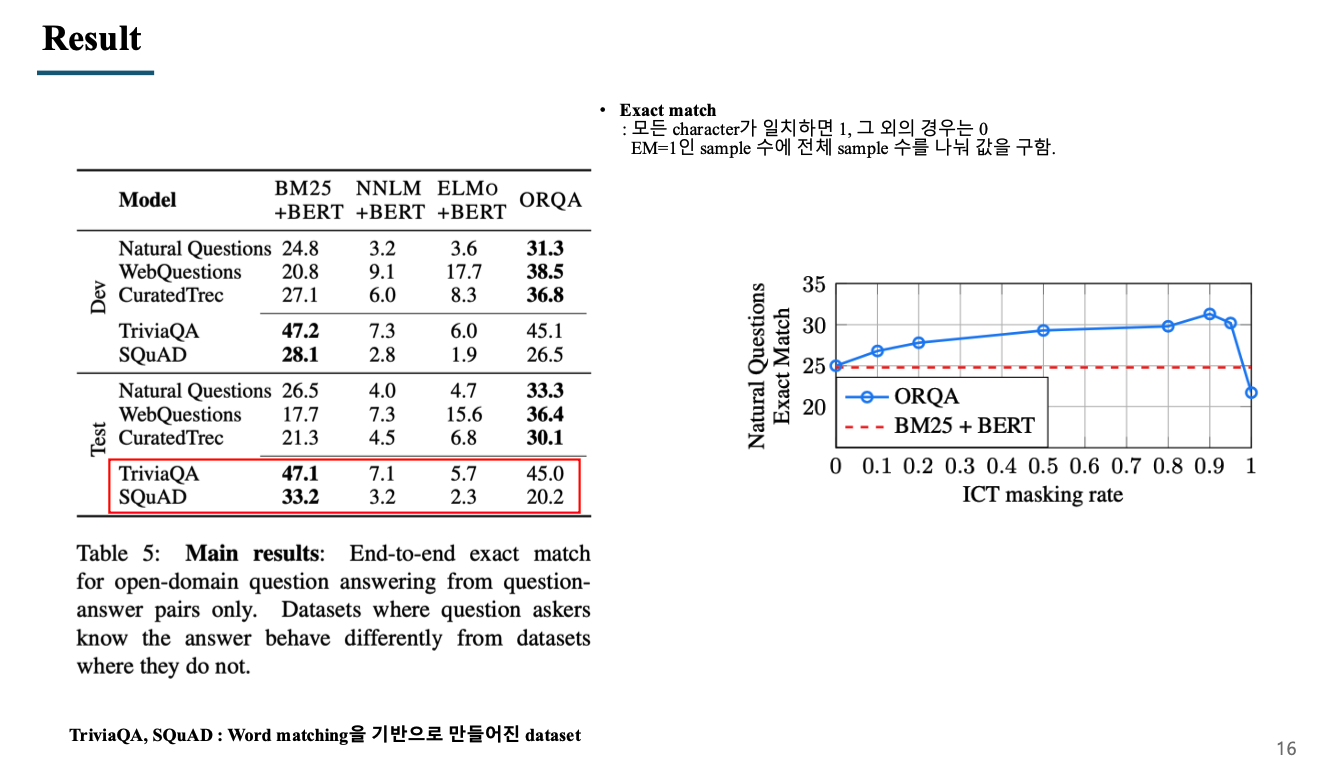 하지만 TriviaQA, SQuAD data는 BM25가 성능이 좋은 것을 볼 수 있는데, 이 이유는 이 두 개의 데이터를 구축할 때 reading comprehension을 기반으로 질문에서 답을 추론할 수 있도록 유사한 단어가 이미 질문에 포함되어 있도록 구축을 하였음. 즉, word matching으로 관련된 문서와 정답을 찾을 수 있도록 질문이 주어졌기 때문에 BM25와 같은 알고리즘의 성능이 높은 것을 확인할 수 있음.