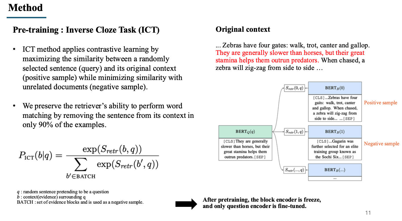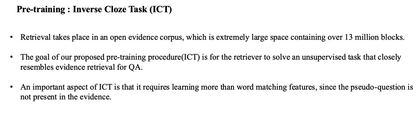 - 따라서 본 논문에서는 Inverse Cloze task(ICT) 라는 pre-training 방식을 제안하여 retriever를 사전학습함.