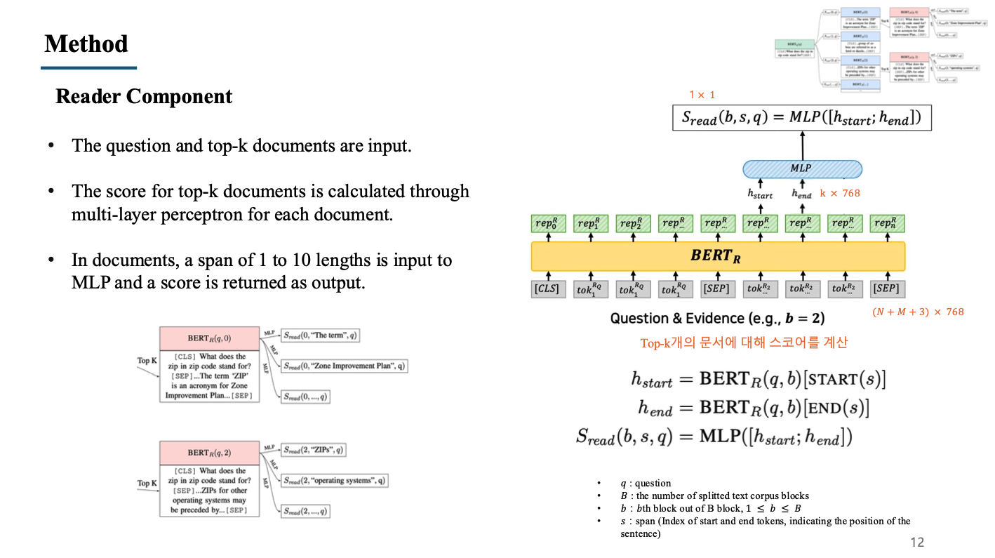 - Reader에는 앞서 설명한 retriever에서 전달받는 top-k개의 문서와 질문이 input으로 들어감.