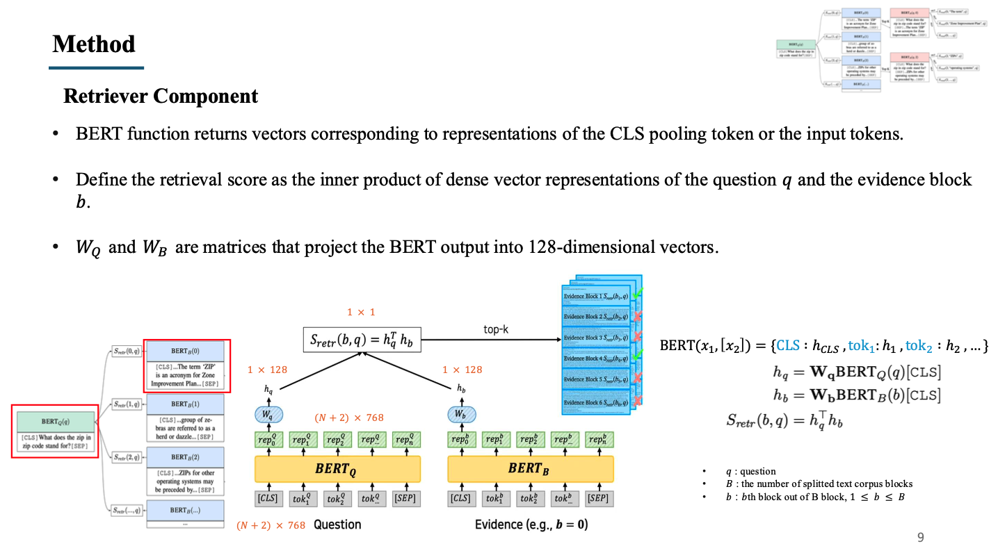 - Retriever는 question과 block을 input으로 받음. 예시로 좌측 그림의 빨간색 박스를 예시로 들겠음.