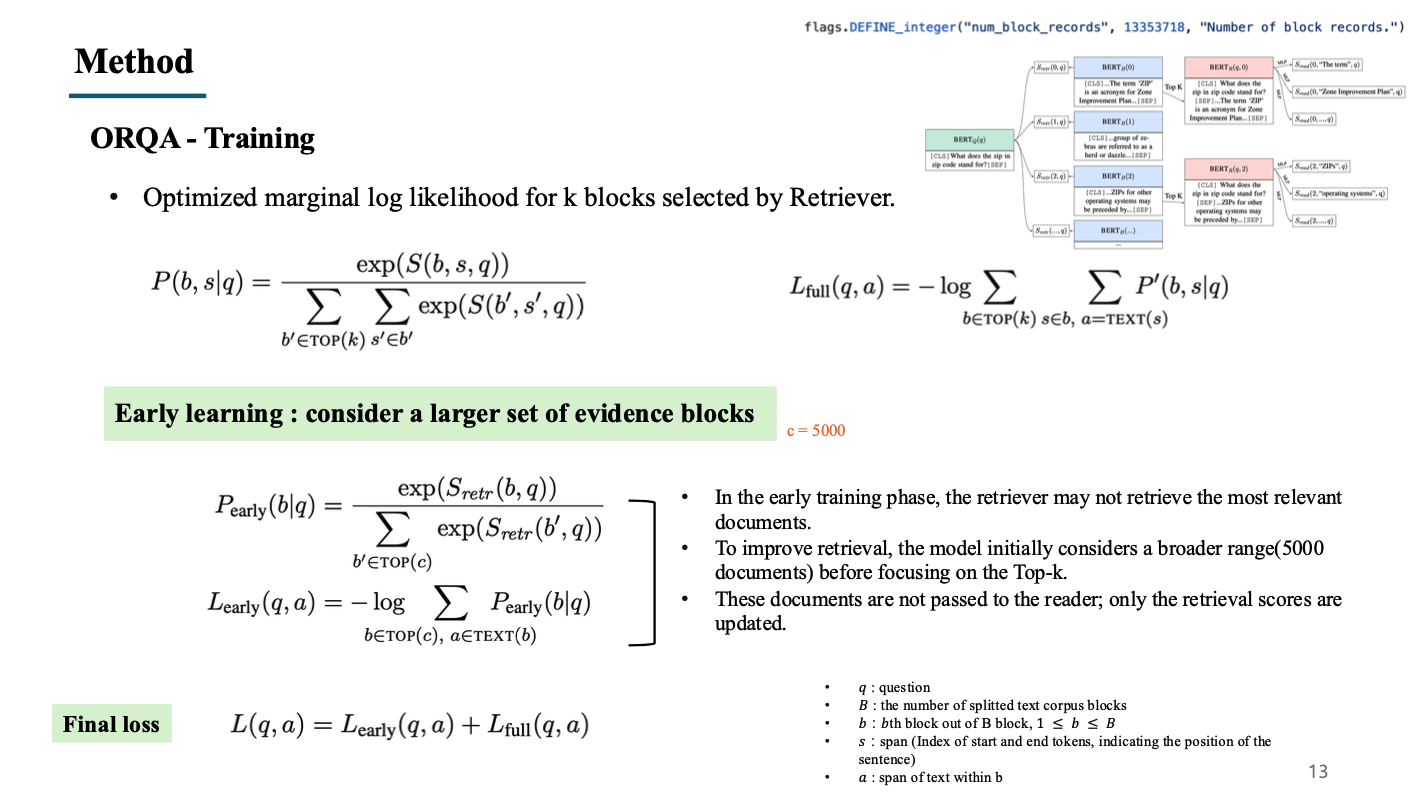 - Sretr(b,q)는 질문과 wikipedia의 block(evidence)이 input으로 들어가 나오는 질문과 문서 사이의 연관성을 나타낸 점수.