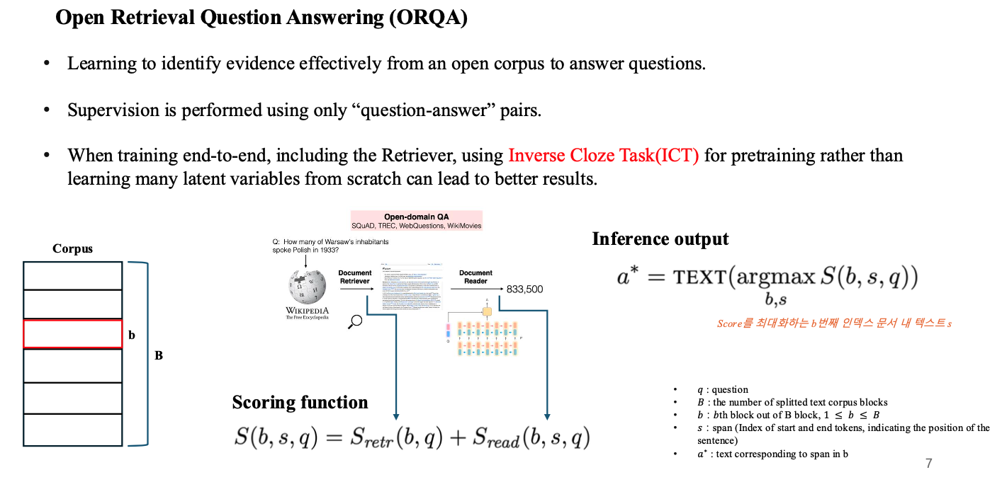 - 논문 소개에 들어가기 앞서 ORQA 모델을 나타내는 수식을 살펴보면, 해당 모델은 S(b,s,q)라는 score로 정의됨.