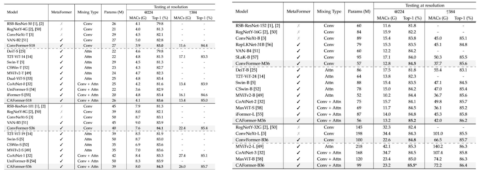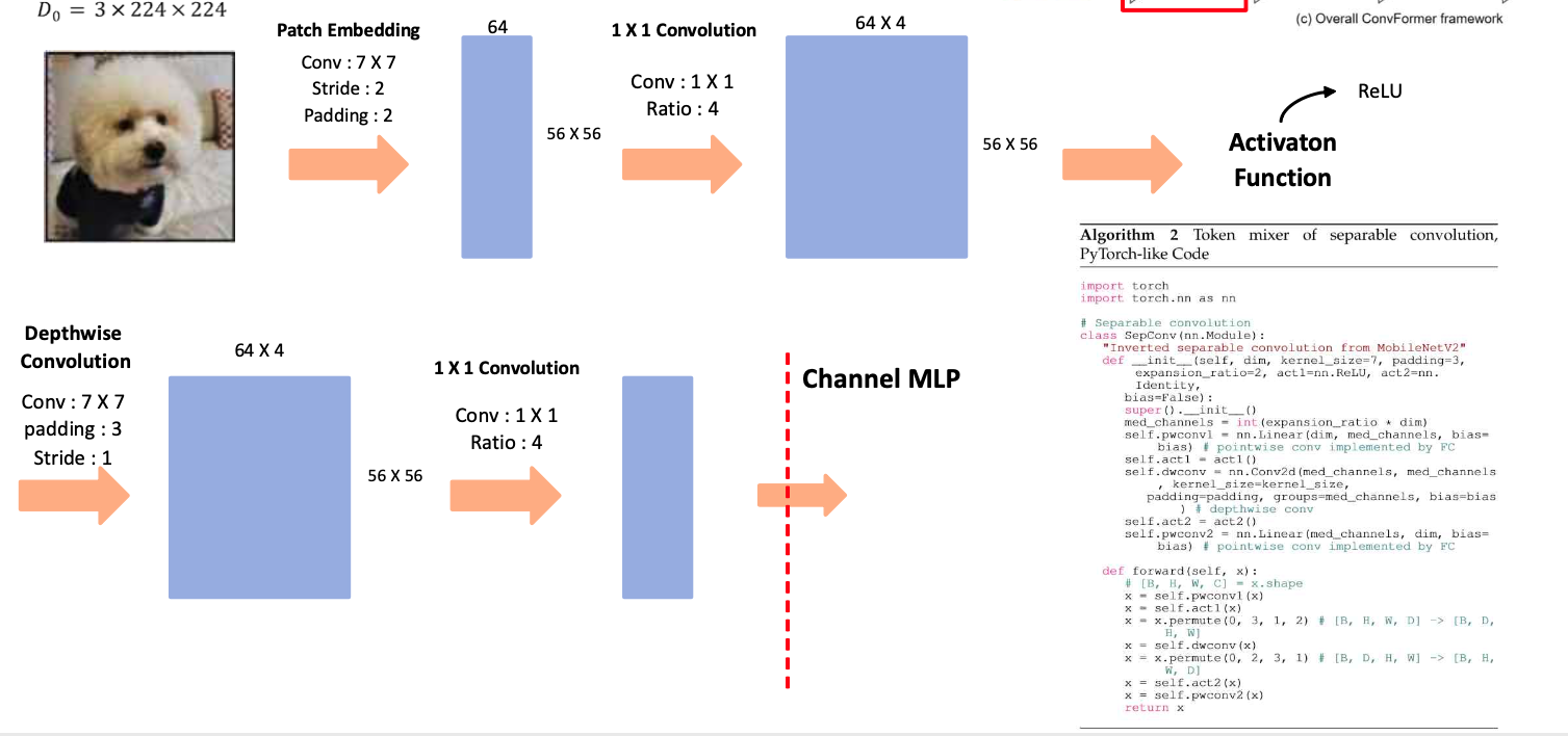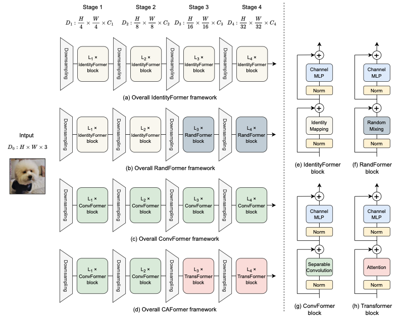 Attention의 경우 기존 ViT와 동일하기 때문에 추가적으로 설명하지 않는다. ConvFormer의 경우 모든 layer에서 Token Mixer를 Convolution연산을 진행하고, 위의 사진에서 코드, 그림과 같이 진행된다.(물론 각 layer마다 size는 다르다.) CAFormer의 경우 앞의 두 layer에서 Token Mixer를 Convolution 연산으로, 뒤의 두 layer는 Attention 연산으로 진행한다.
