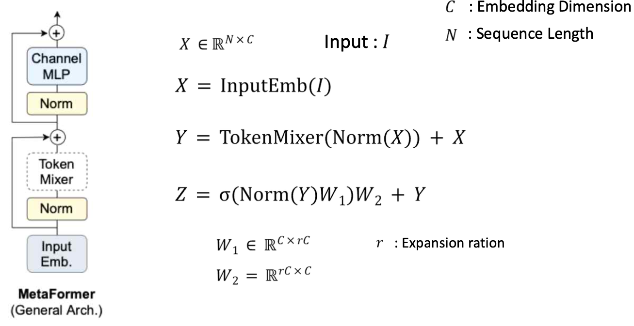 Input I가 들어왔을 때, Embedding을 진행한 것을 X라고 한다. 이후 X에 대해 normalize를 하고 지정하는 Token Mixer를 적용한 뒤 residual connection을 더해준다. 마지막으로 이를 normalize를 해준 뒤 Channel mlp를 거치고 다시 residual connection을 더해주는 형태를 MetaFormer라고 한다.
